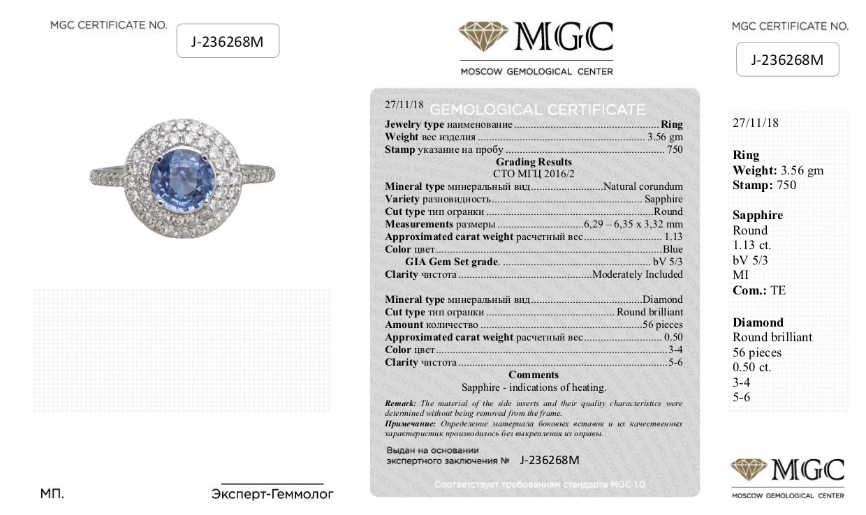 Кольцо из белого золота с сапфиром 1,13 карат и бриллиантами 0,5 карат (сертификат МГЦ)