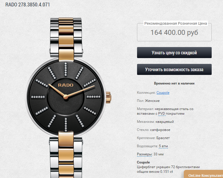 В продаже очень красивые и шикарные женские часы швейцарской фирмы RADO на браслете со вставками цвета розового золота и украшенным циферблатом с 72 бриллиантами.