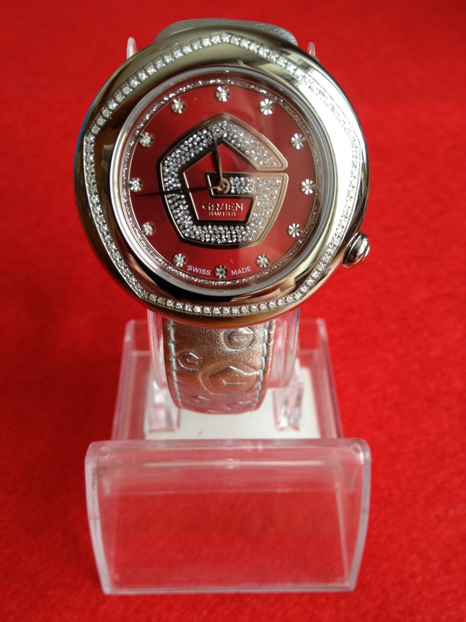 Циферблат: красный с 12 бриллиантами + бриллиантовая россыпь в центре и дорожка по кругу