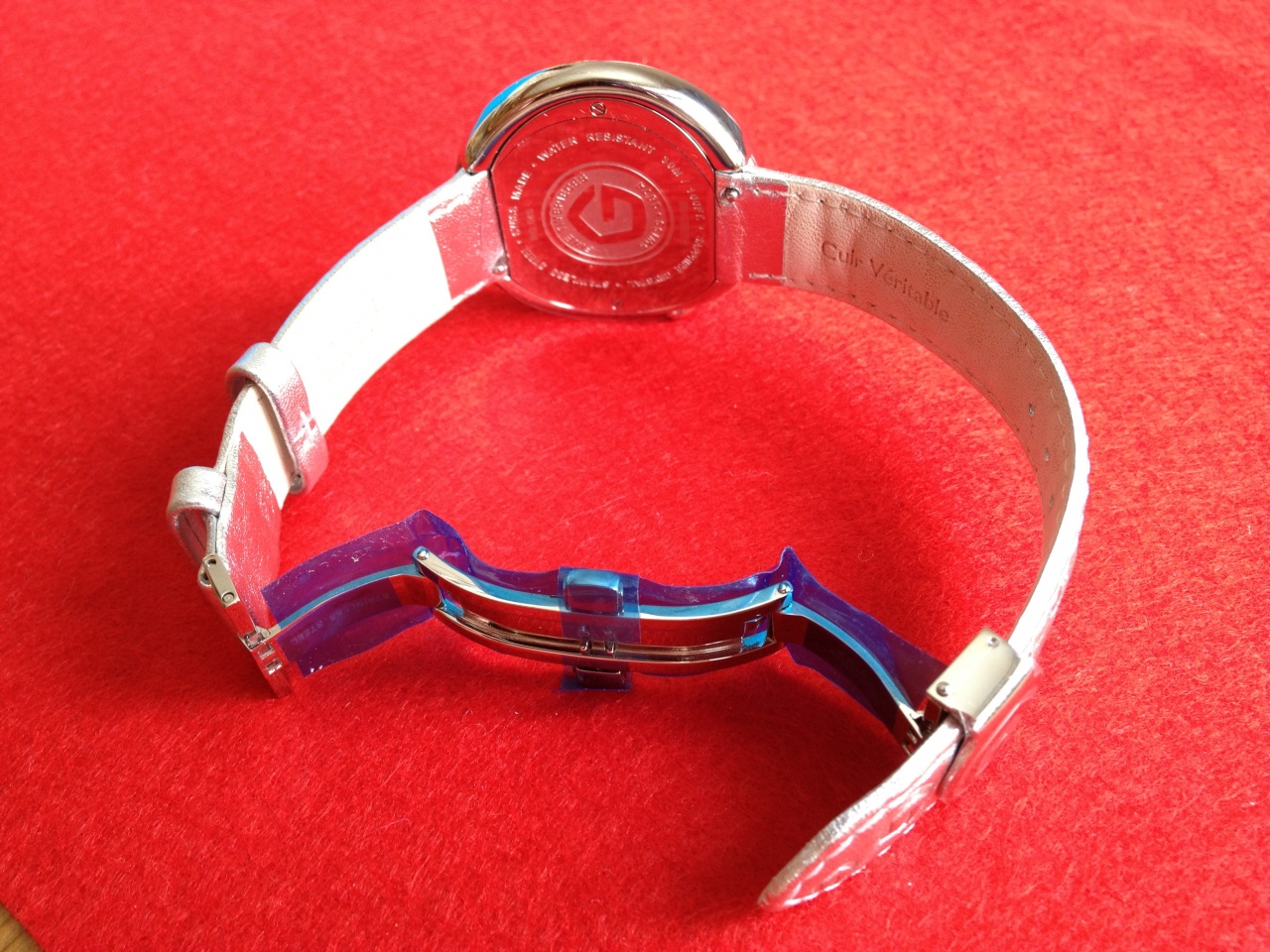 Браслет: серебристый кожаный ремешок + дополнительно красный кожаный ремешок (оба ремешка с функцией быстрой замены)