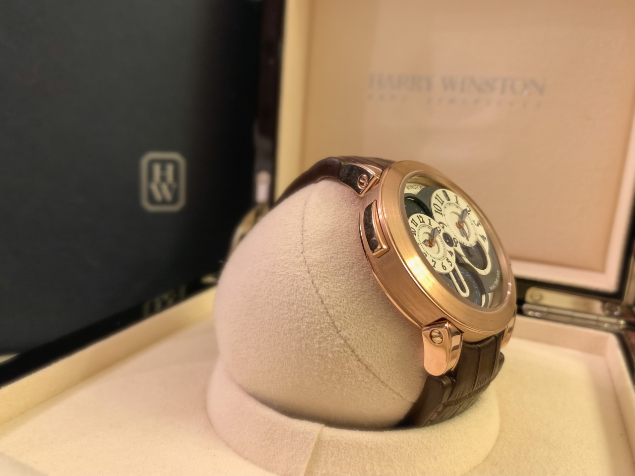 Harry Winston Ocean Dual Time, круглый корпус из 18-каратного розового золота (диаметром 44 мм), коричневый ремешок из крокодиловой кожи с пряжкой из 18-каратного розового золота.