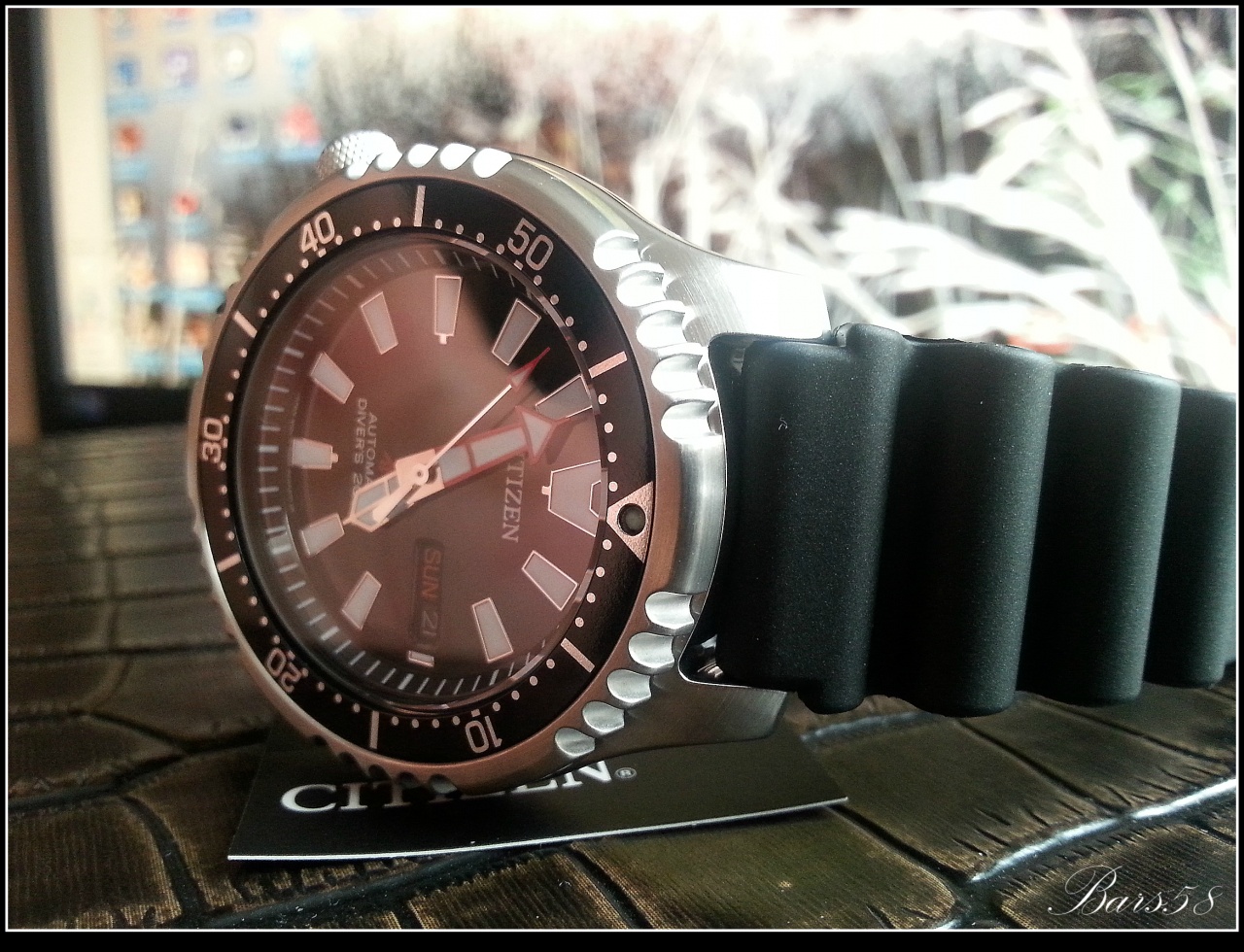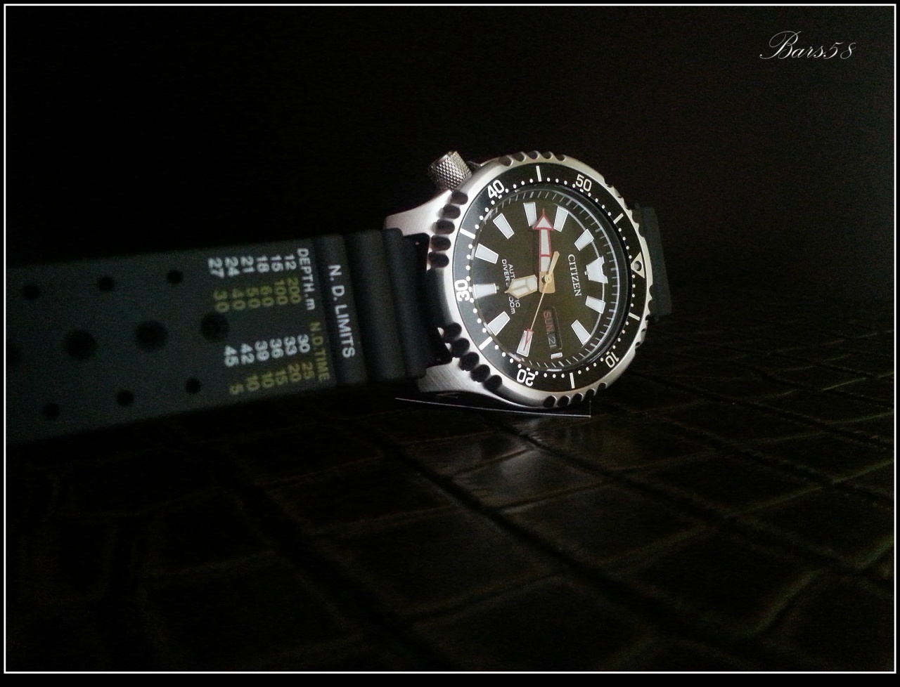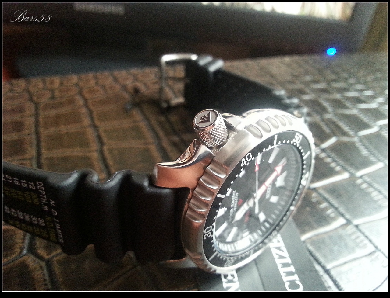 Завинчивающаяся заводная головка c логотипом PROMASTER-( является знаком Citizen для профессиональной серии дайверов),расположена на левой стороне,смещена на отметку 8 часов (обеспечивает защиту от ударов, а также комфорт для владельца, не вдавливая заводную головку в запястье)