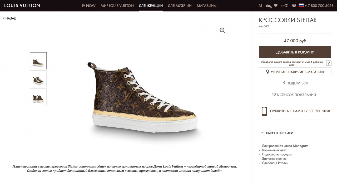 "Плавные линии высоких кроссовок Stellar дополнены одним из самых узнаваемых узоров Дома Louis Vuitton – легендарной канвой Monogram. Отделка лаком придает деликатный блеск этим стильным высоким кроссовкам, а застежка-молния завершает дизайн."