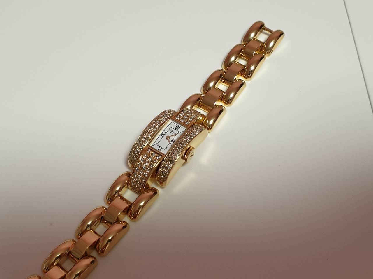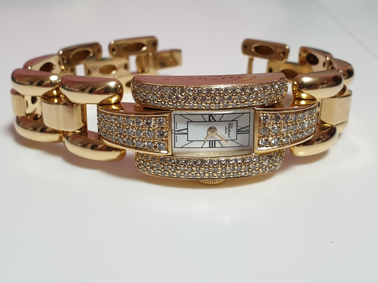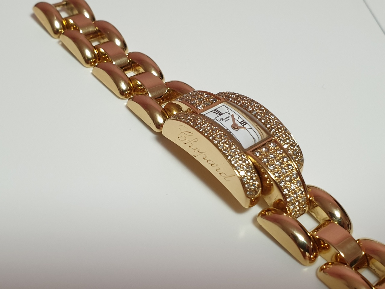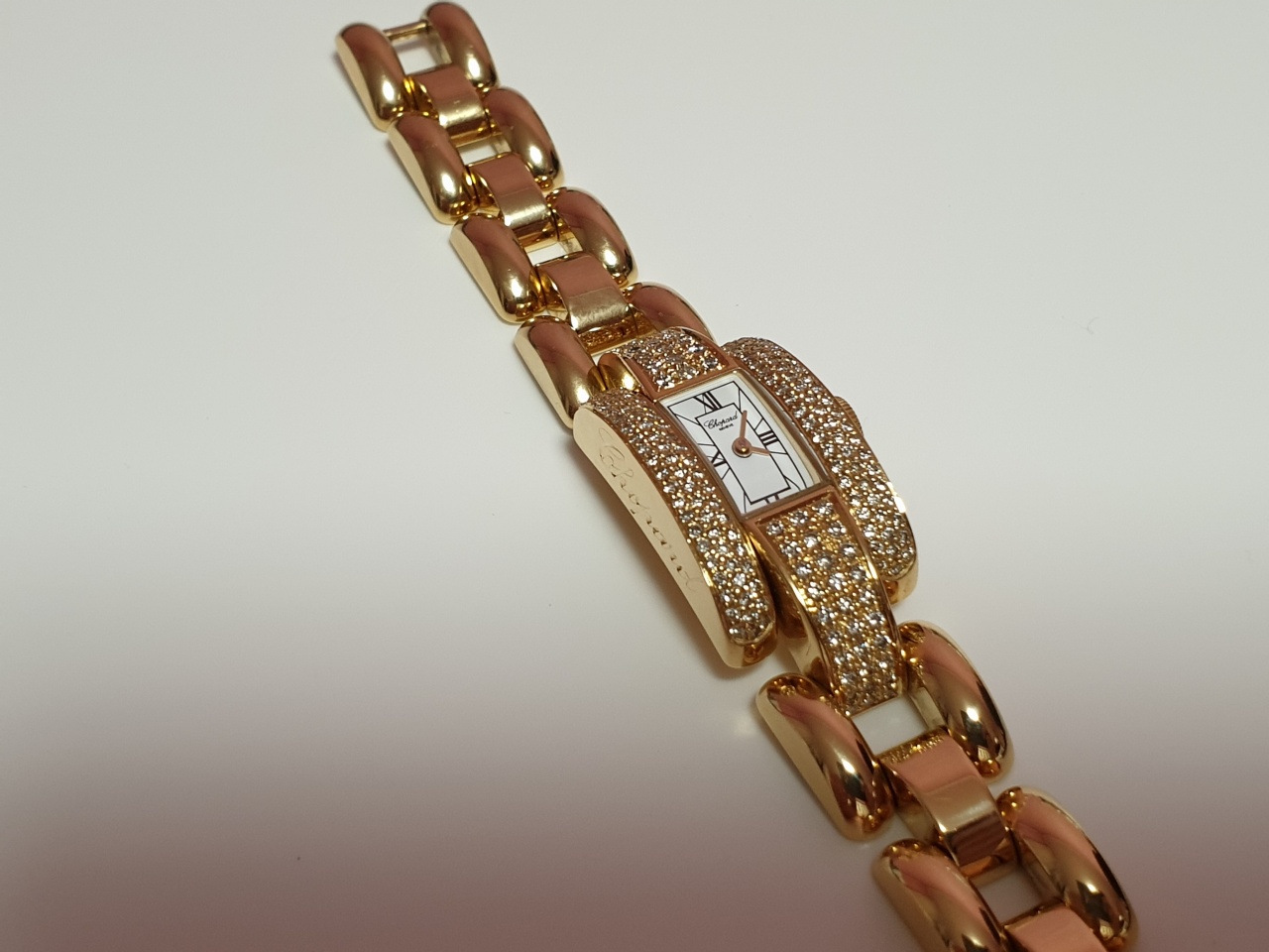 Шикарные женские Шопард Ла Страда, выполнены полностью из золота 750 пробы, все пространство безеля вокруг циферблата инкрустировано бриллиантами в количестве 182 штук.