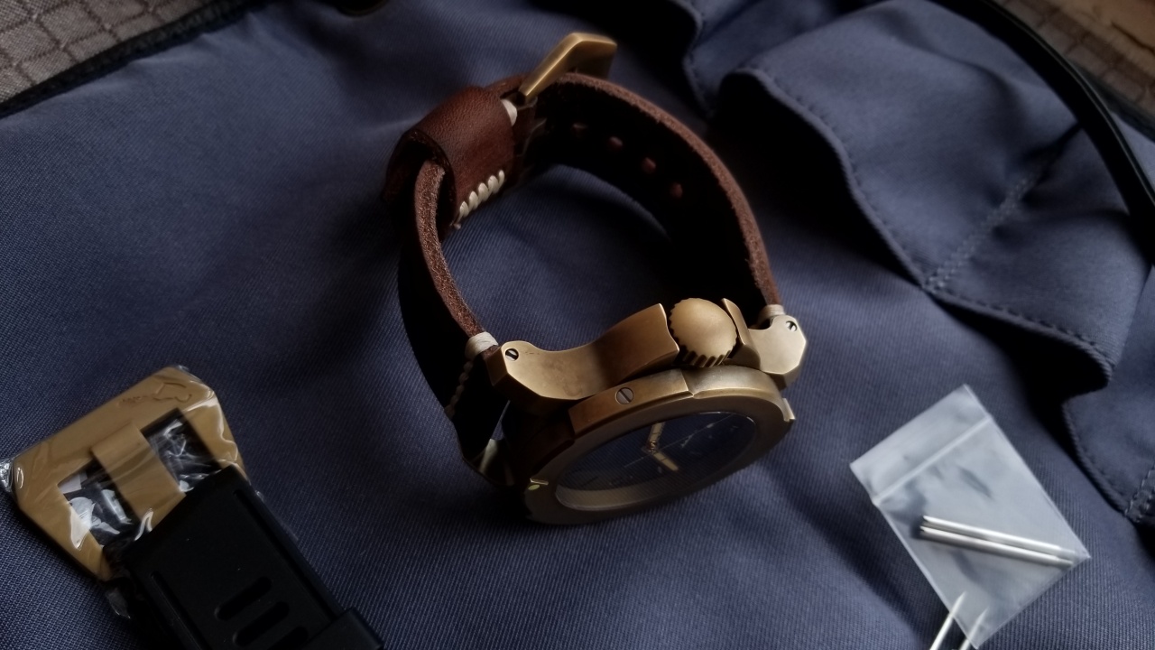 Ремешок: 24 мм коричневая кожа и 24 мм резиновый ремень.