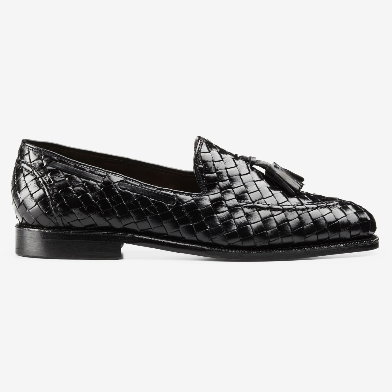 Шикарные мужские лоферы из черной плетеной кожи с мягким блеском, украшенные кожаными кисточками.