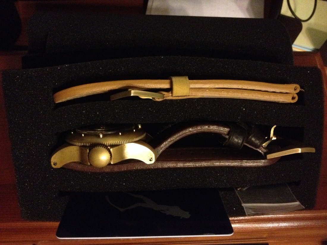 Комплект - штатный ремень темно-коричневый - на часах, дополнительный, также штатный - светлый - вообще не использовался, запасные шпильки, герметичный кейс.