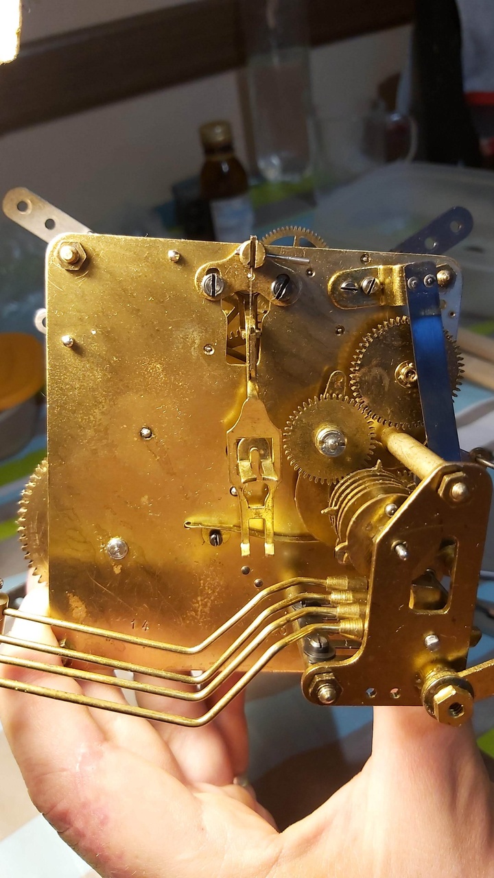Довольно необычно сделано переключение между "обычным" боем и мелодией - шестеренки с запилом по краю, что имеет эффект "сцепления". Потратил пару часов пока добился идеального сочетания всех шестерней друг с другом. Как я понял, изначально поломка была в обрыве кончика в пружине боя, но по ходу "ремонта" прилично наломали дров...