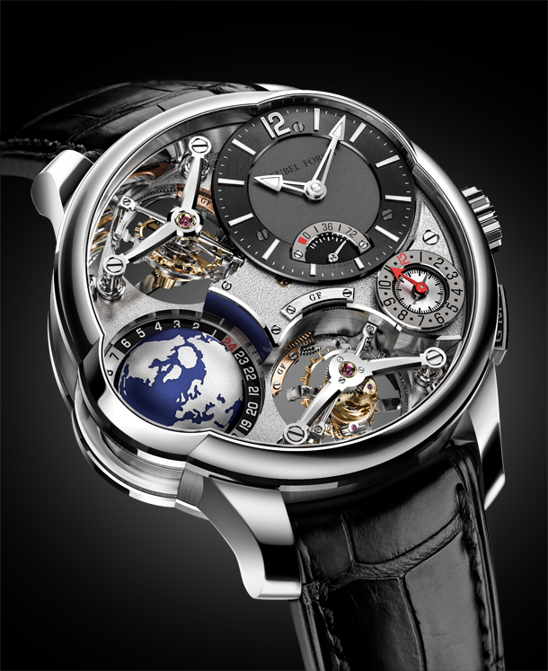 Робер Гребель и Стивен Форси проявили невероятную творческую смелость, объединив свое второе фундаментальное изобретение – четыре турбийона – с авангардной интерпретацией функции GMT, оснащенной вращающимся земным шаром внушительного размера. Выдающиеся часы с индикацией времени трех часовых поясов и всемирного времени отличаются филигранно исполненной трехмерной конструкцией. Уникальная серия состоит из 66 экземпляров, 11 из которых выполнены из белого золота.