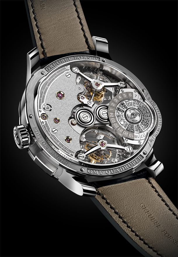 Объединив четыре турбийона и механизм GMT, компания Greubel Forsey совершила настоящий технологический прорыв и создала новый калибр с тремя заводным барабанами с ручным заводом, состоящий из 805 деталей. Гениальные изобретатели при решении столь сложной задачи уделили особое внимание архитектурным принципам проектирования и предложили часы, в которых трехмерное видение представлено на нескольких уровнях. Индикатор часов и минут между «1» и «2 часами» находится в высшей точке циферблата, особую выразительность которому придает слегка асимметричный корпус и указатель гарантирующего хронометрическую точность 72 -часового запаса хода.