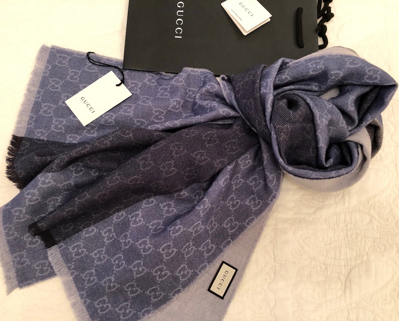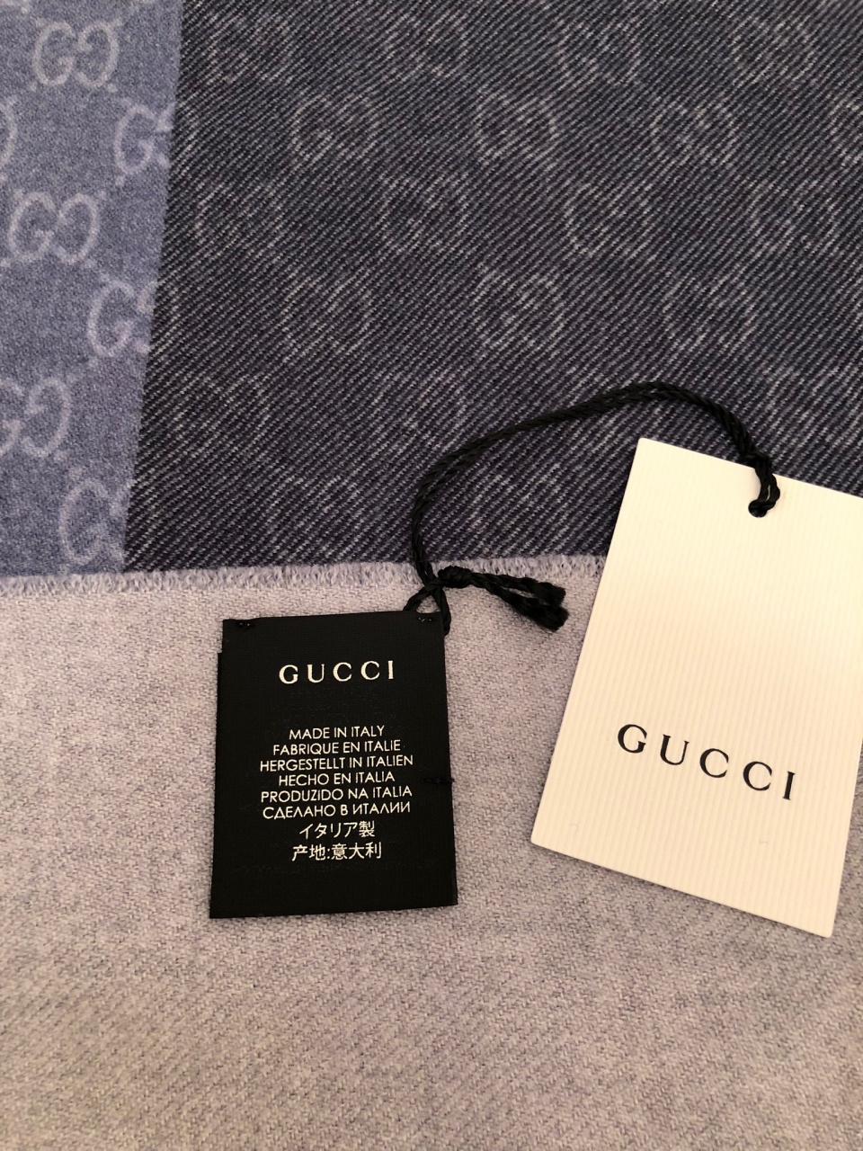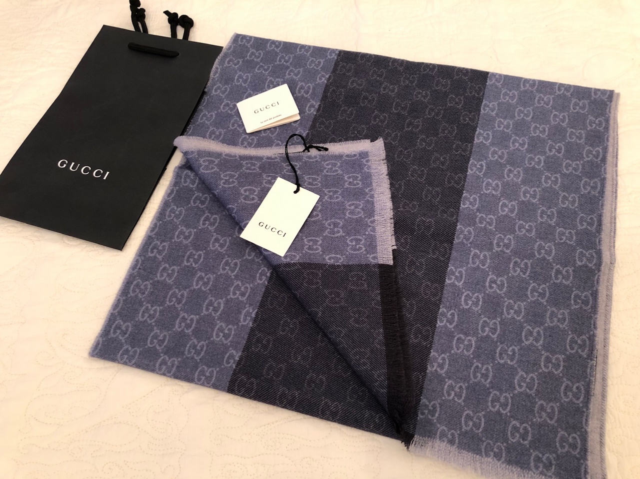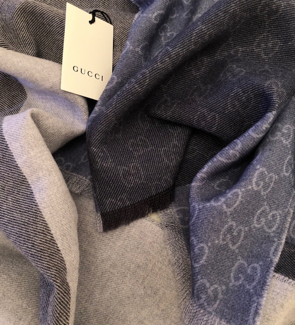 Шарф GUCCI - Signature. Мягкая 100% шерсть. Новый. Рисунок Supreme GG. Двусторонний: синий и серый