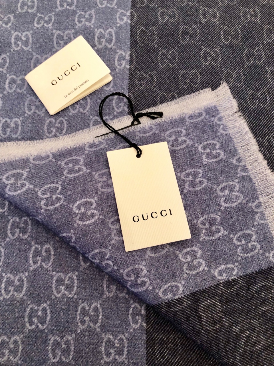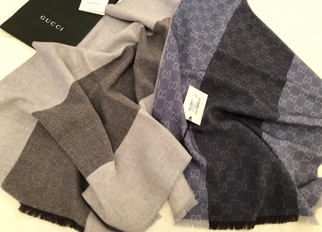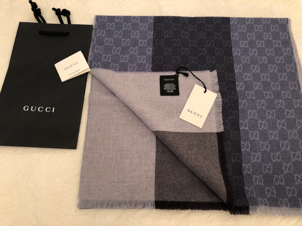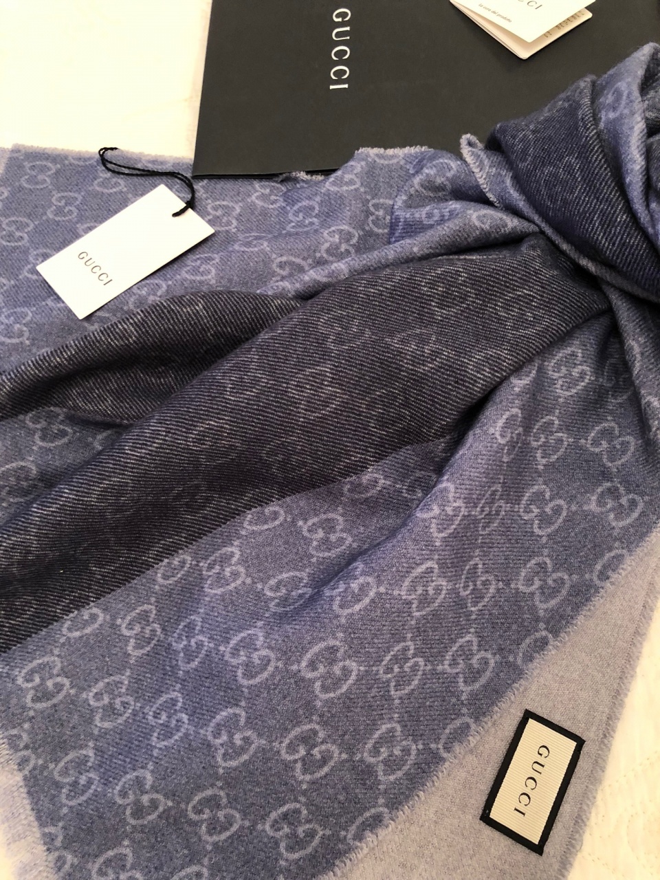 Шарф GUCCI - Signature. Мягкая 100% шерсть. Новый. Рисунок Supreme GG. Двусторонний: синий и серый