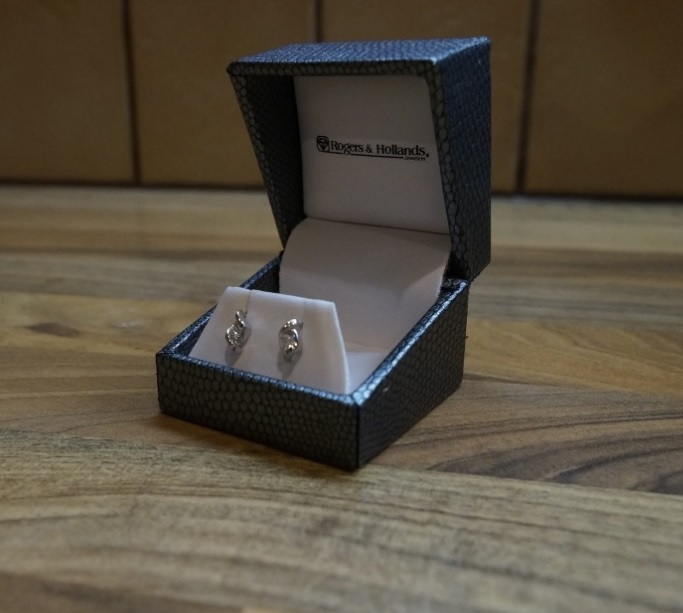 Характеристики бриллиантов (оценка эксперта в магазине Rogers&Hollands, в котором я покупал в США): цвет 4 (I), чистота 6 (I1), вес (общий, для двух сережек) 0,24 карата (1/4 kt).