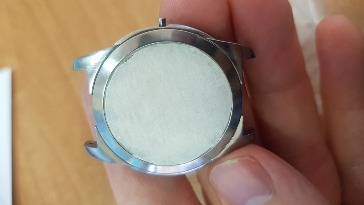 Шлифовка корпуса, крышки и браслета с замком. Матовый слой снят попыткой шлифовки пастой ГОИ, вследствии чего есть разводы.
