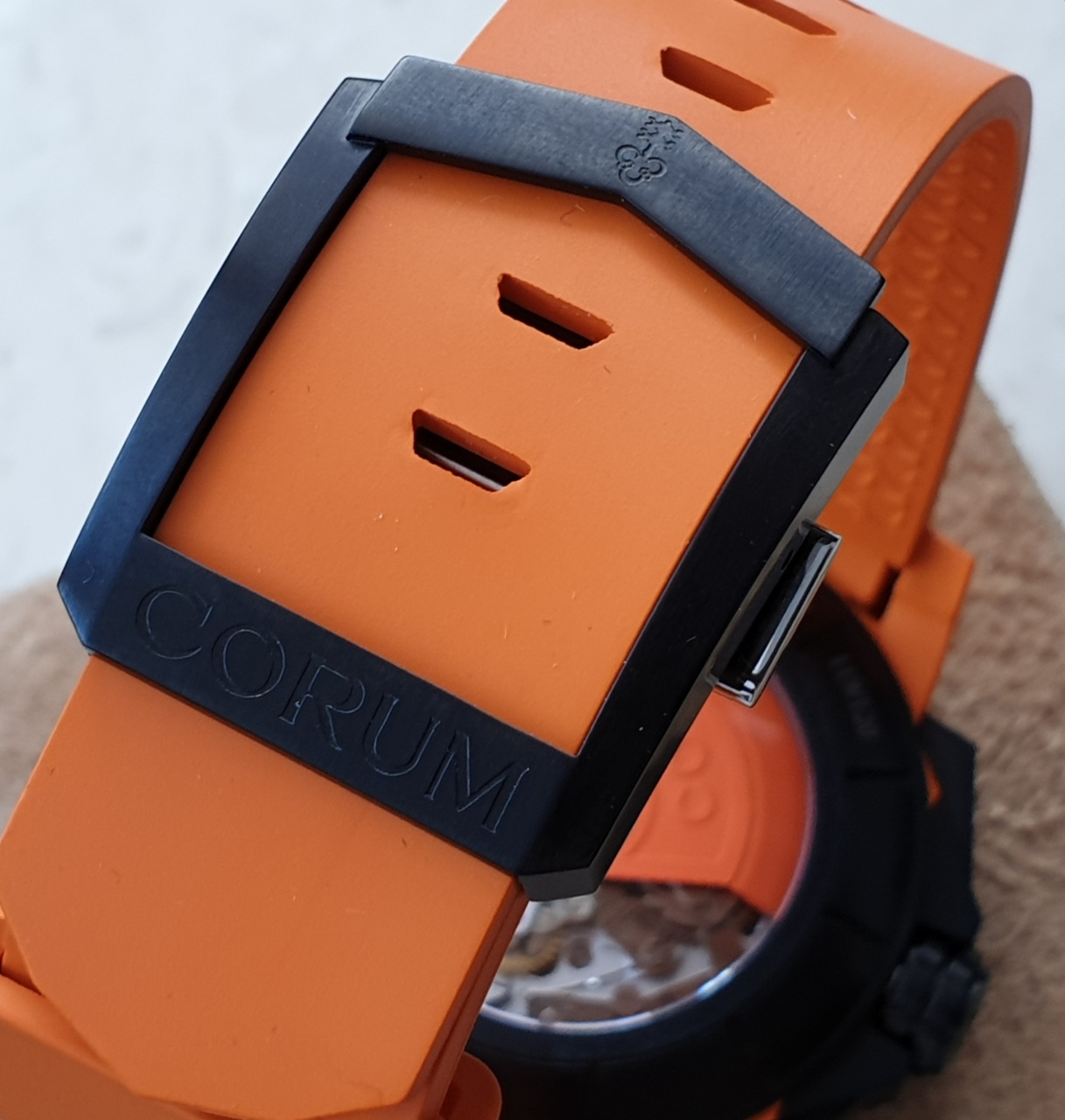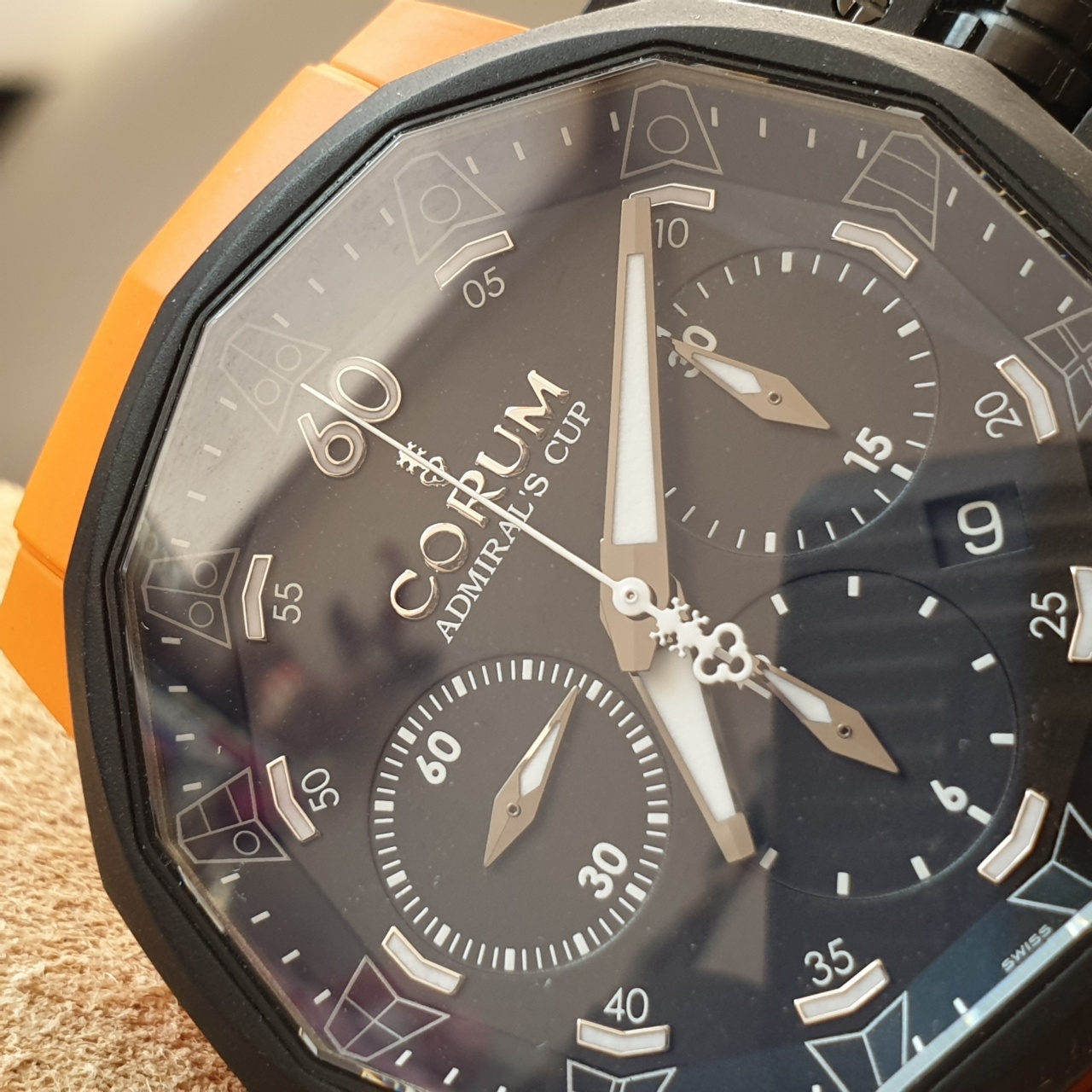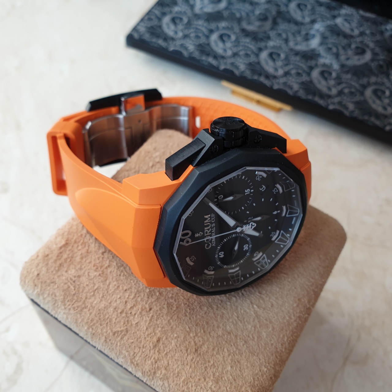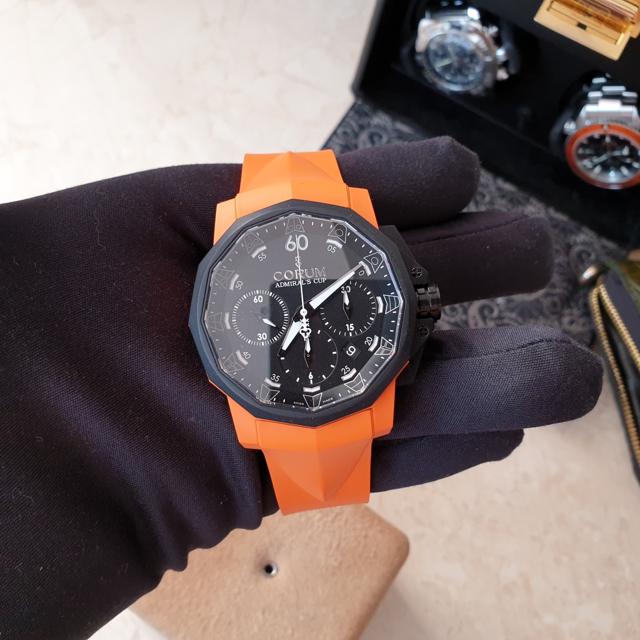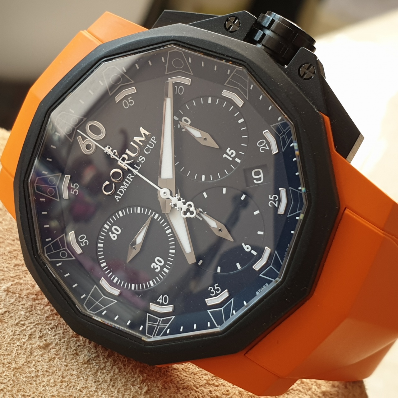 Продолжаем знакомиться с изделиями от всемирно известного швейцарского производителя часов Corum, основанного в 1955 году. Рассмотрим коллекцию, которая называется Admiral`s Cup Challenger. Модель 753.814.02/F374 AN21 это часы, которые подтверждают статус производителя. Двенадцатигранный комбинированный корпус часов из титана с нанесением каучука. Размеры корпуса составляют 44 мм. Основные функции данной модели это часы, минуты, секунды, отображение даты. Данная модель оснащена хронографом и имеет сертификат швейцарской Службы официального контроля за хронометрами (COSC). Черный циферблат с белыми маркерами закрыт под прочным сапфировым стеклом с антибликовым покрытием, благодаря которому не стоит беспокоиться о повреждениях и царапинах. Заводной ключ находится по стандарту на позиции трех часов. Ремешок часов выполнен из каучука с титановой вставкой. Механизм завода - автоматический, оснащён калибром СО 753, запас хода составляет 48 часов. Что касается водонепроницаемости, то она увеличена по сравнению со стандартами, и составляет сто метров. Данная серия была выпущена ограниченным тиражом в количестве 120 шт.