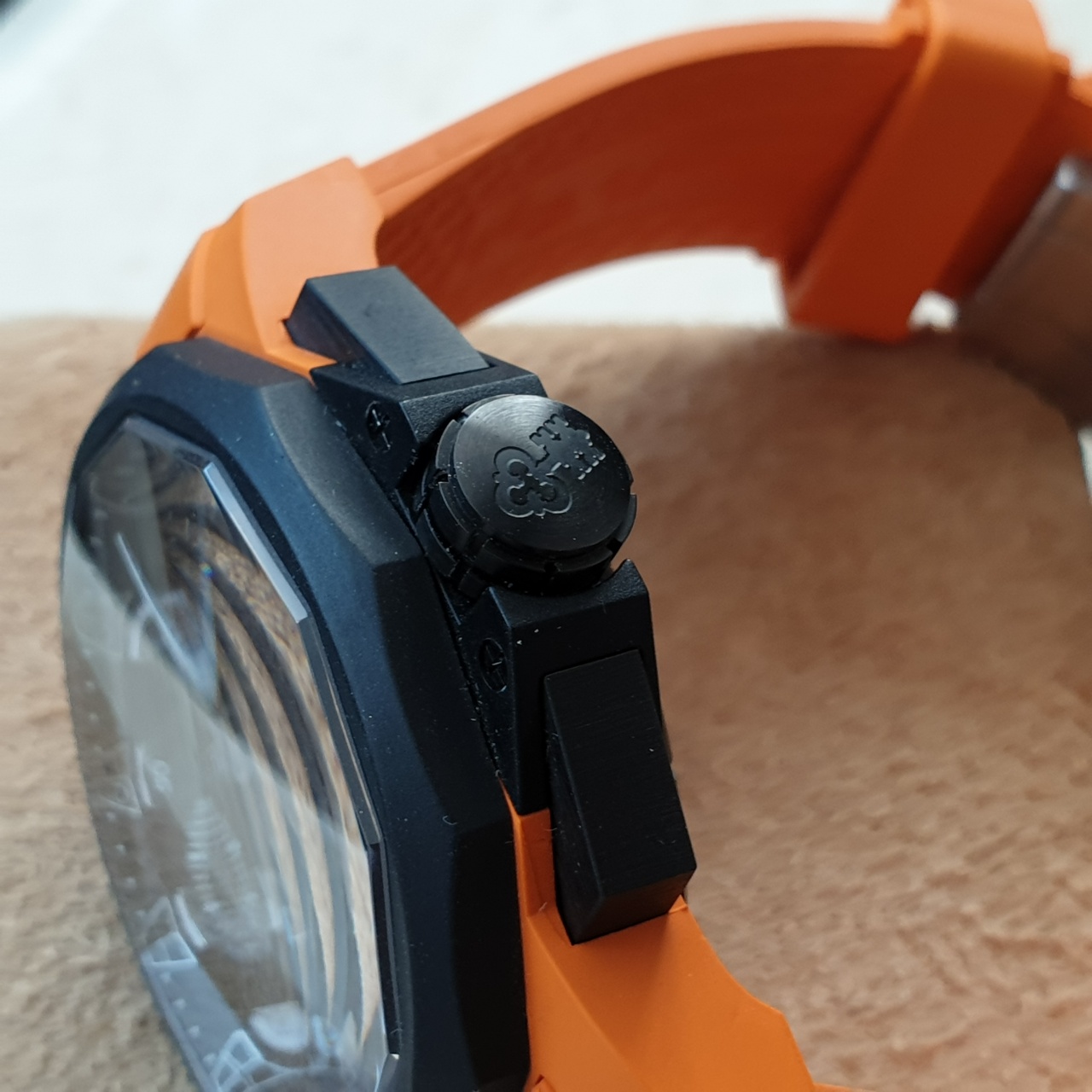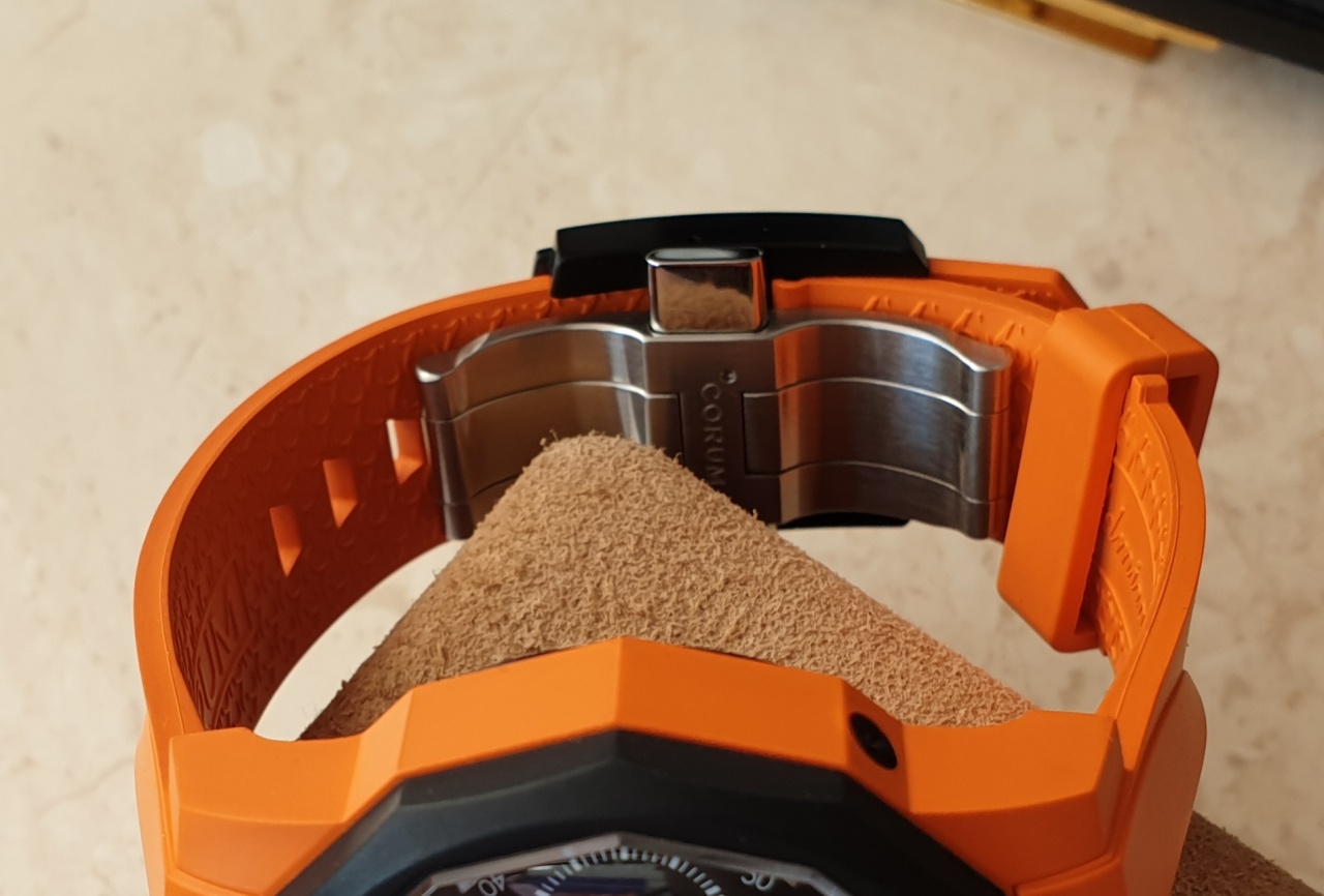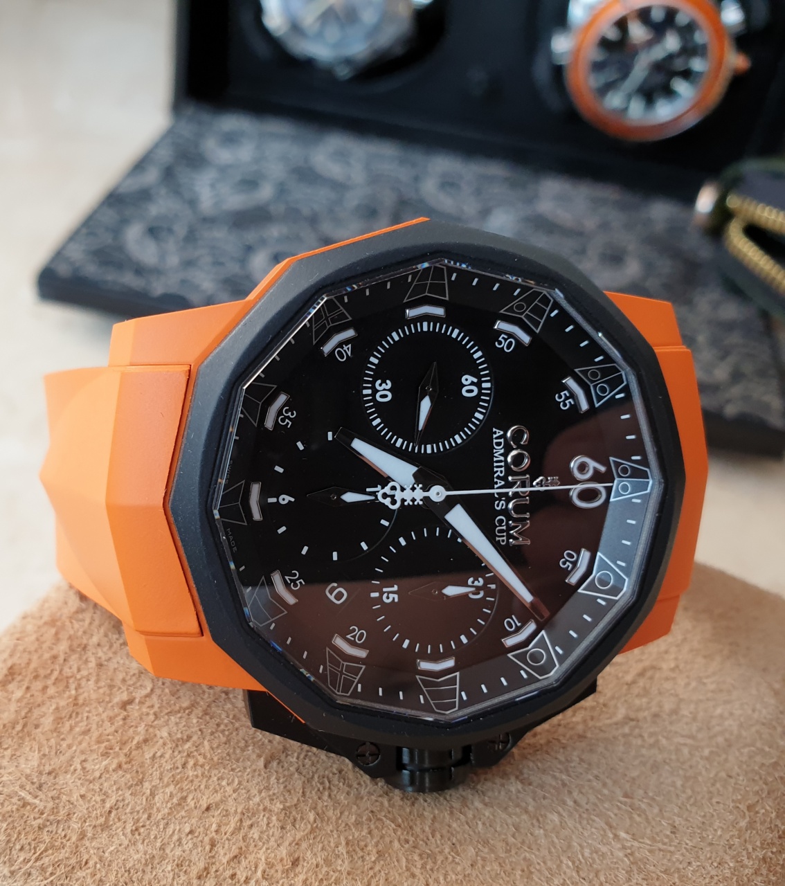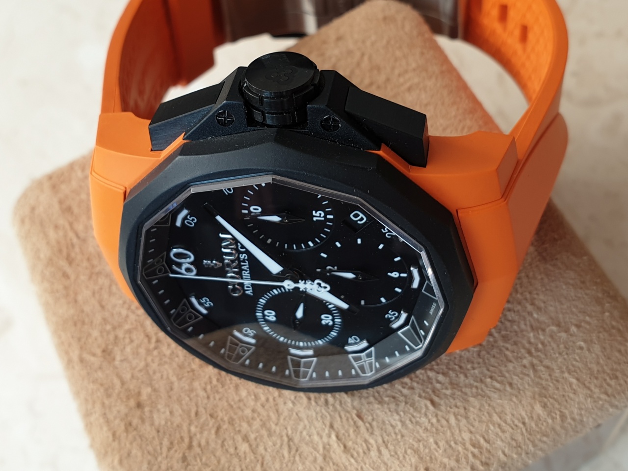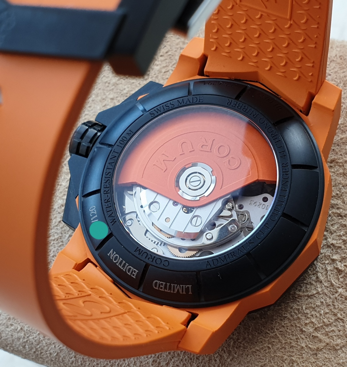 Продолжаем знакомиться с изделиями от всемирно известного швейцарского производителя часов Corum, основанного в 1955 году. Рассмотрим коллекцию, которая называется Admiral`s Cup Challenger. Модель 753.814.02/F374 AN21 это часы, которые подтверждают статус производителя. Двенадцатигранный комбинированный корпус часов из титана с нанесением каучука. Размеры корпуса составляют 44 мм. Основные функции данной модели это часы, минуты, секунды, отображение даты. Данная модель оснащена хронографом и имеет сертификат швейцарской Службы официального контроля за хронометрами (COSC). Черный циферблат с белыми маркерами закрыт под прочным сапфировым стеклом с антибликовым покрытием, благодаря которому не стоит беспокоиться о повреждениях и царапинах. Заводной ключ находится по стандарту на позиции трех часов. Ремешок часов выполнен из каучука с титановой вставкой. Механизм завода - автоматический, оснащён калибром СО 753, запас хода составляет 48 часов. Что касается водонепроницаемости, то она увеличена по сравнению со стандартами, и составляет сто метров. Данная серия была выпущена ограниченным тиражом в количестве 120 шт.