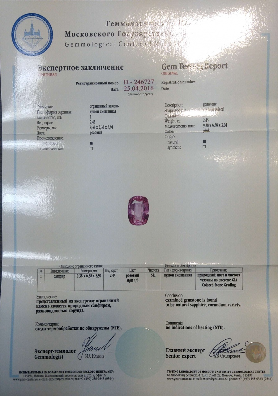 Кольцо из белого золота с розовым сапфиром 2,45 карат и бриллиантами 0,35 карат (сертификат МГУ) - Часовой форум Watch.ru
