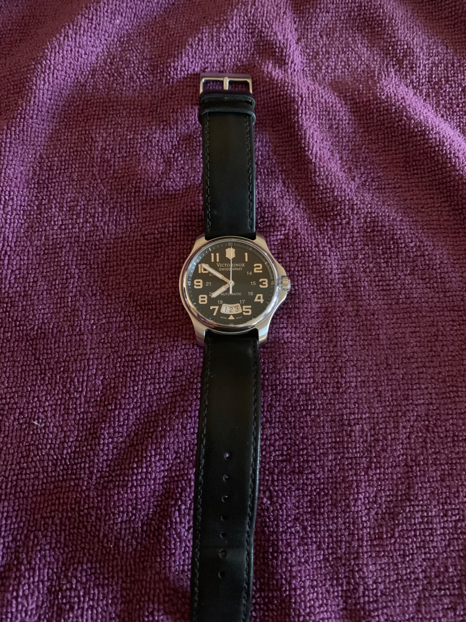 Механические часы c Victorinox Swiss Army 241370 с автоподзаводом, в отличном состоянии, есть коробка. Носил на кожаном ремне, оригинальный металлический также в комплекте. Покупал осенью на Амазоне.