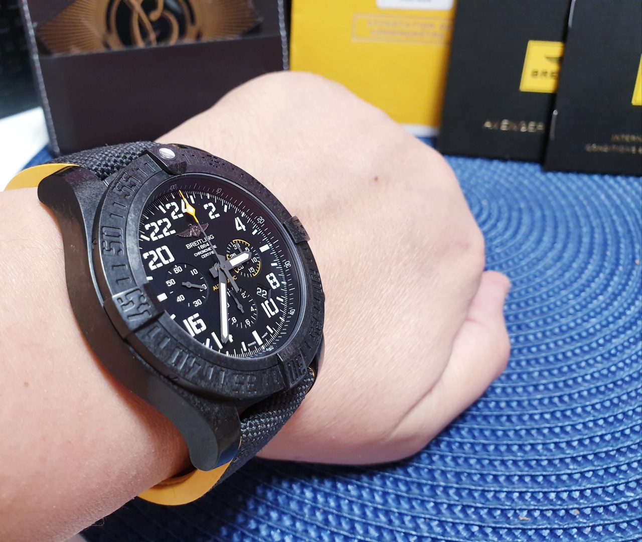 Часы 2016 года выпуска Avenger Hurricane (реф. XB1210E4/BE89/257S/X20D.4) с крупным корпусом из материала Breitlight®, в черном тонне с элементами желтого, от оригинального Breitling. В первую очередь модель поражает своим крупным диаметром - это 50,00 мм. Поражает, также, часовой механизм с 24-часовым дисплеем выполнен в военном стиле. Его работа отвечает за функцию хронографа, счетчики которого разместились на: 6:00 часах - 12-часовой и на 9:00 часах - 60-секундный. Корпус был изготовлен из инновационного материала Breitlight®. Он в 3.3 раза легче титана и в 5.8 раз легче стали, но обладает высокой прочностью со стойкостью к царапинам, антимагнетизмом, растяжению и коррозии, антиаллергенными свойствами и термостойкостью. вращающийся безель с выгравированной тахометрической шкалой. Строгий черный циферблат украшен 24-часаовой шкалой с люминесцентным покрытием и секундной разметкой. Над поверхностью циферблата скользят стрелки, указывающие час и минуты (с люминесцентным покрытием), а также тонкая секундная стрелка хронографа. Указатель даты помещен на 4:30 часах.