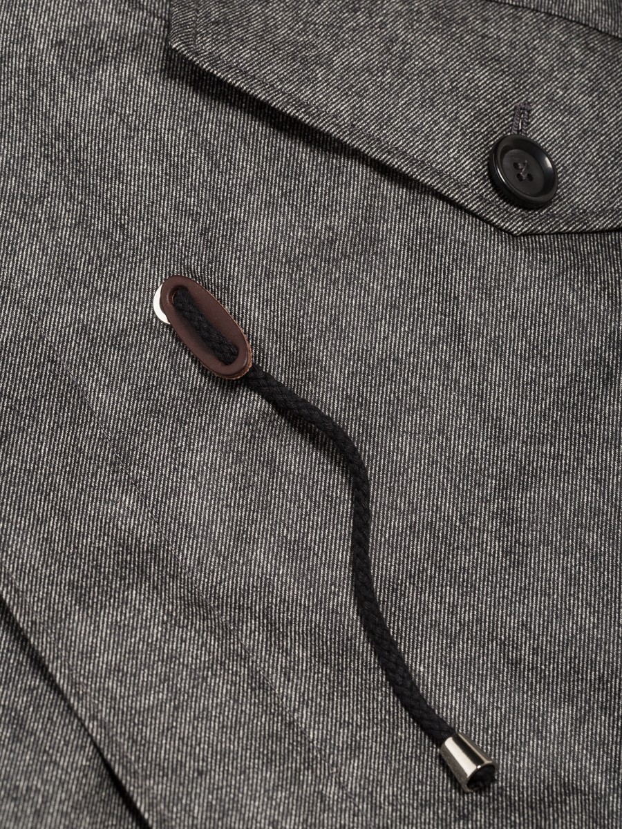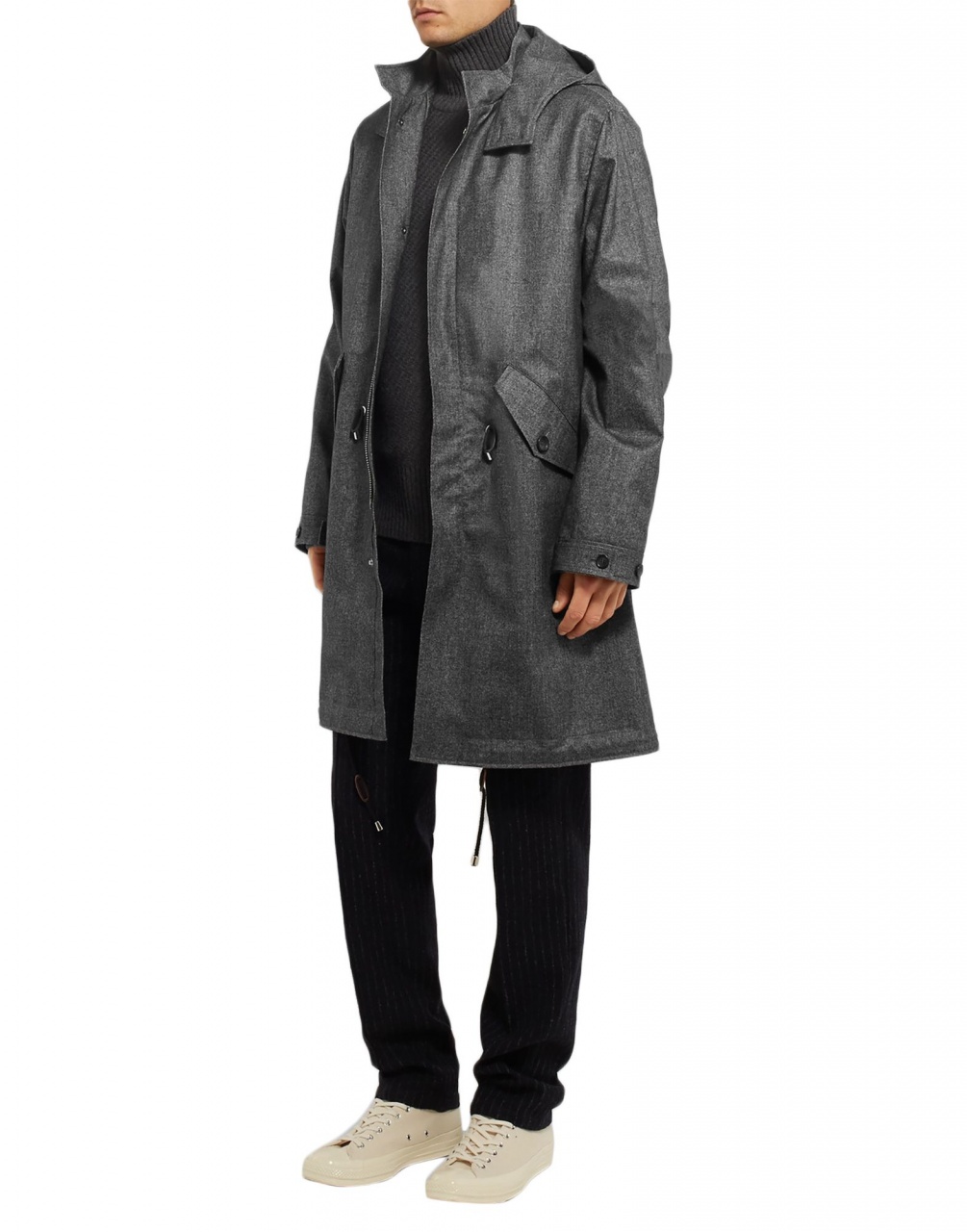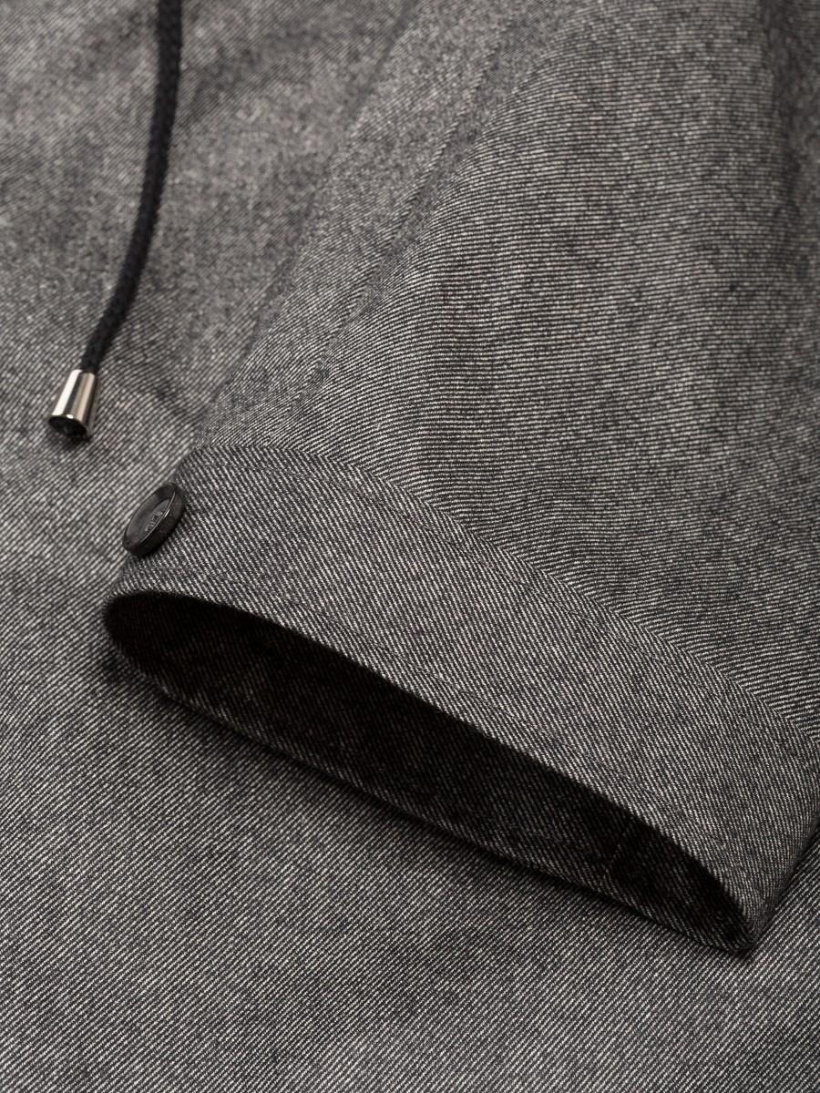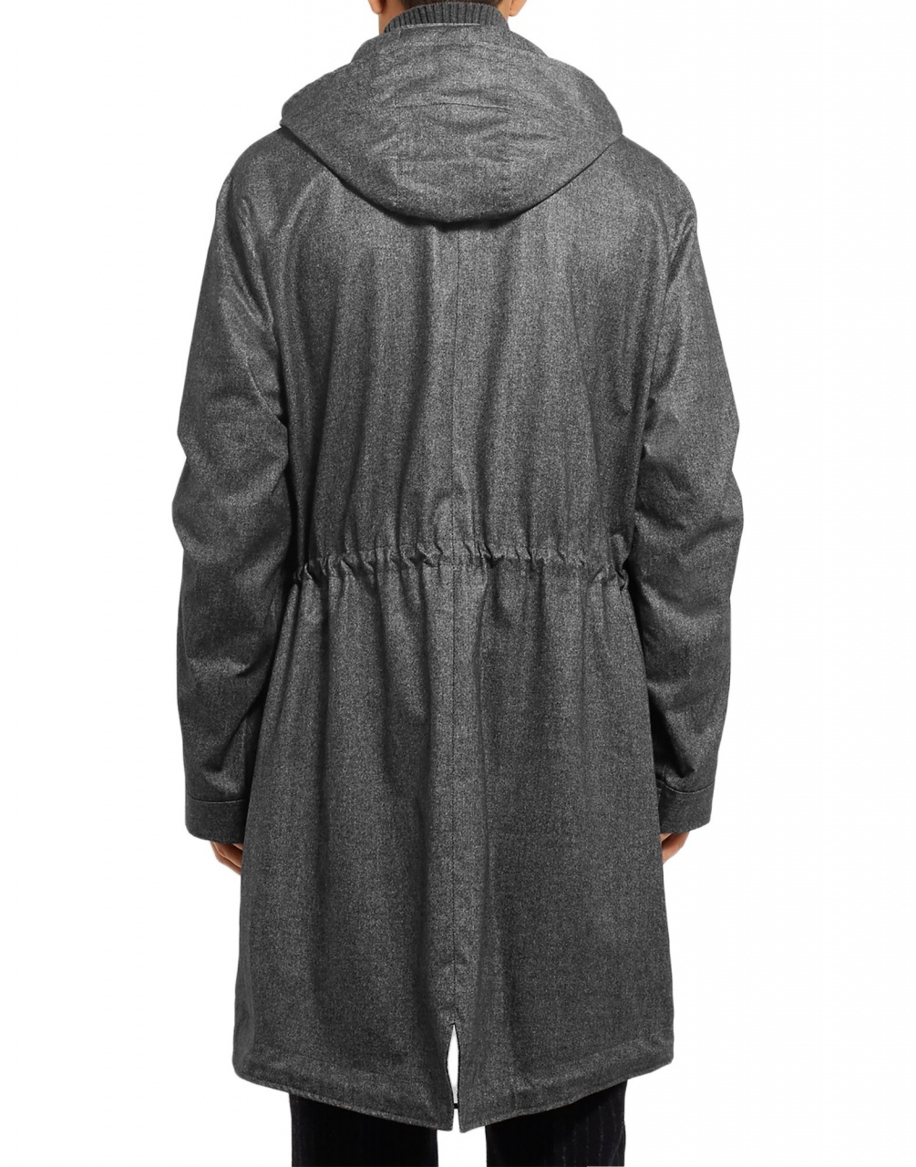 Съёмный капюшон, кулиски (утяжки) на талии и внизу.