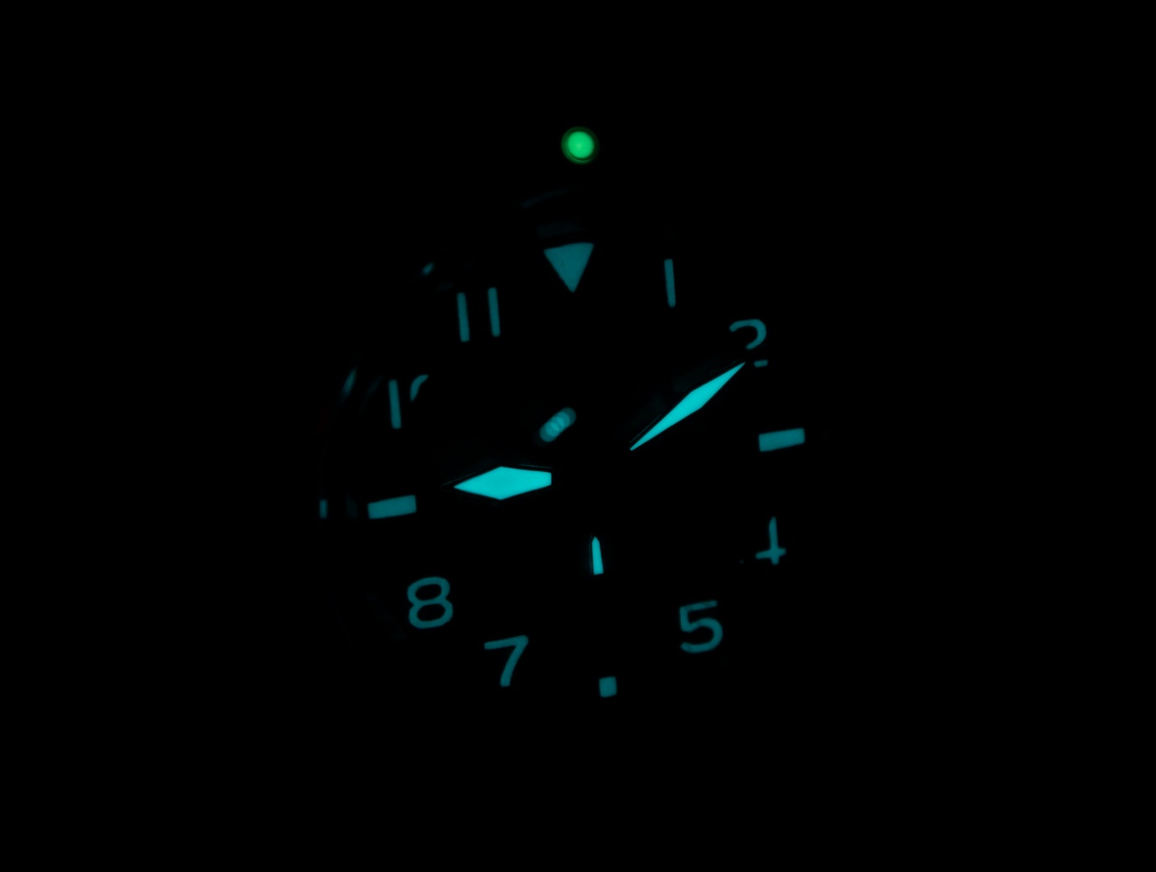 Однонаправленный дайверский безель, голубой люм на метках и стрелках.