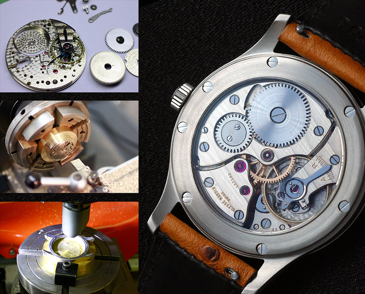 Там же располагается Hamilton. Занимаются изготовлением часов с винтажными механизмами. В частности модель 222-PP на калибре Hamilton 921 и 923. А так же производят ремонт антикварных часов и на заказ оправляют старые механизмы в новые корпуса. Пишут, что вышедшие из строя детали, делают сами, на своем оборудовании. Имеют свой калибр 801. На сколько он свой и кто был его прообразом, лучше скажут знатоки. Но выглядит очень красиво.