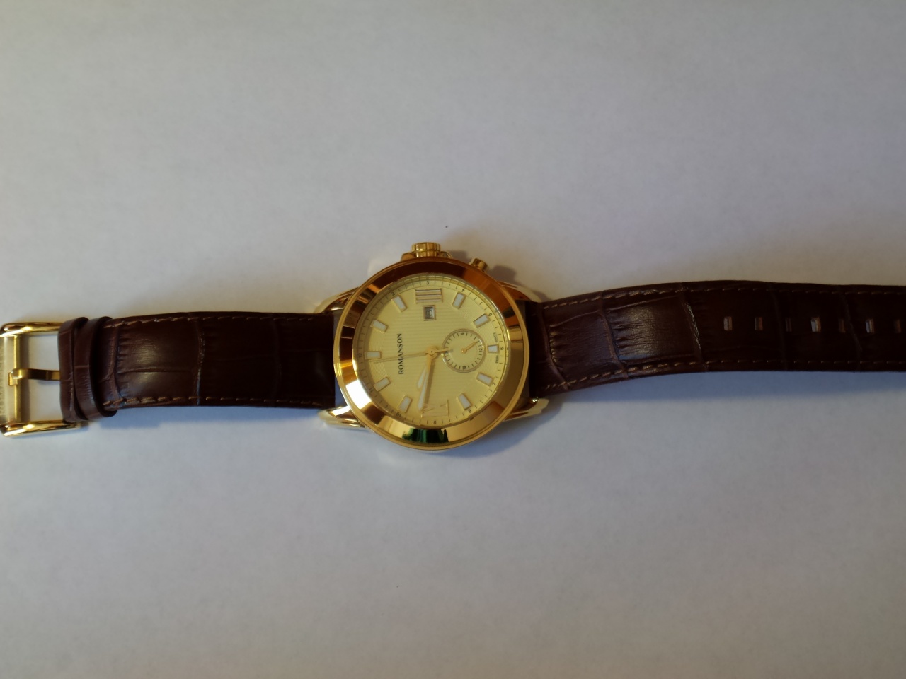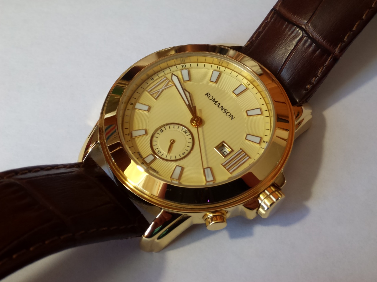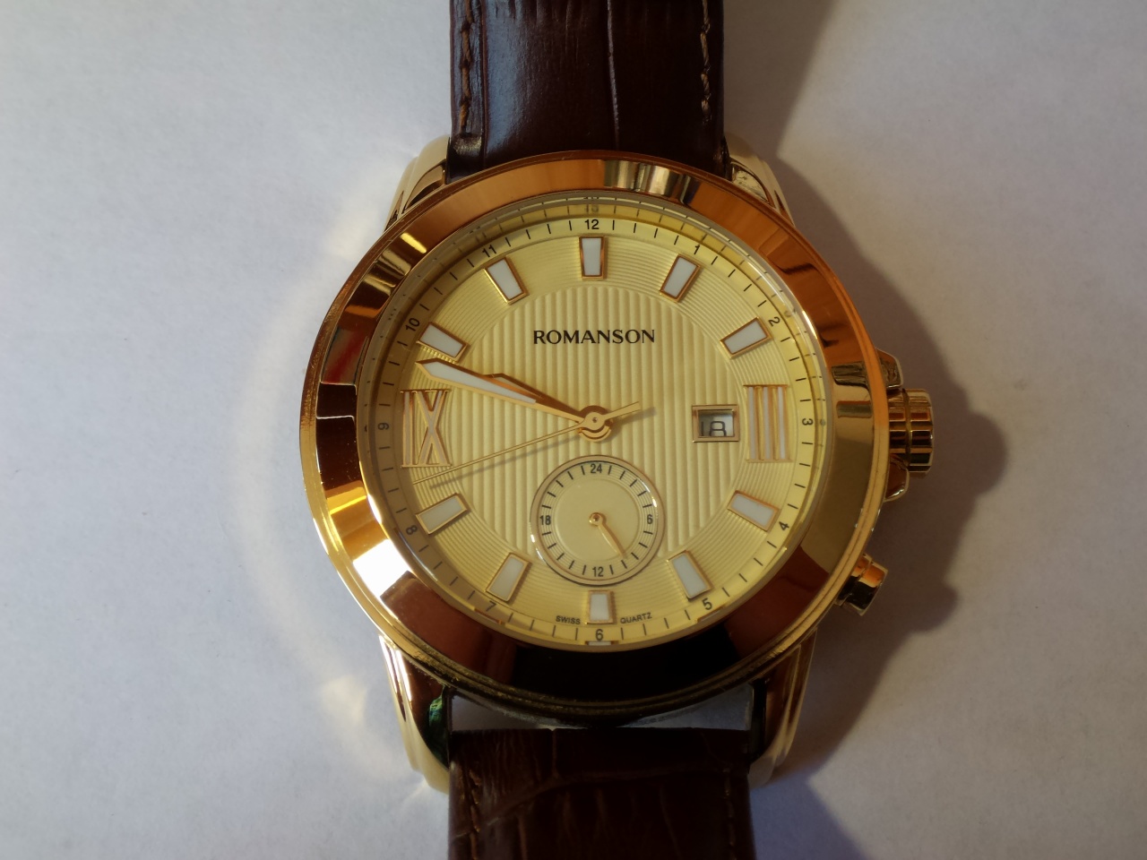 Теперь о самих часах: корпус часов изготовлен из нержавеющей стали с покрытием под золото. Механизм кварцевый. Водостойкость не высока, всего 3 атм. циферблат симпатичный , рифленый, с брутальными стрелками. Ремешок похож на кожаный с твердой поверхностью. Бакля немаленькая, с надписью Романсон. На руке сидят удобно. Часы изготовлены в Корее. Сходная форма корпуса широко эксплуатируется азиатскими производителями, поэтому уникальности не представляет.