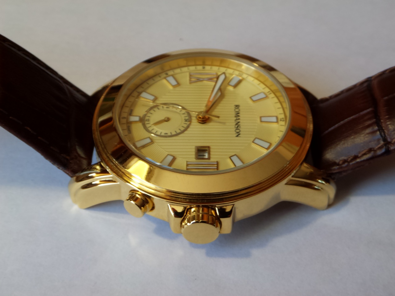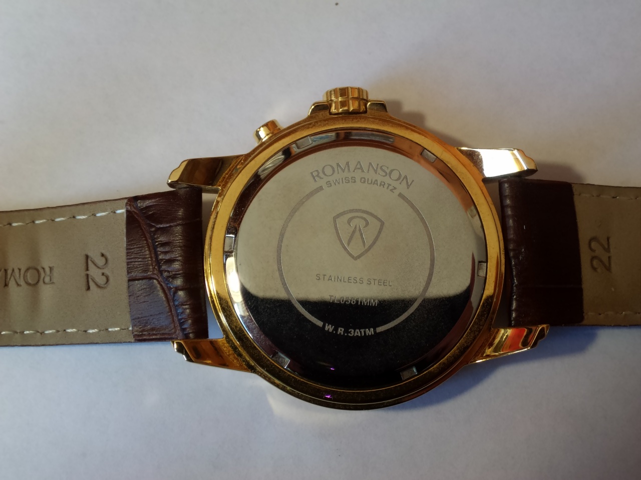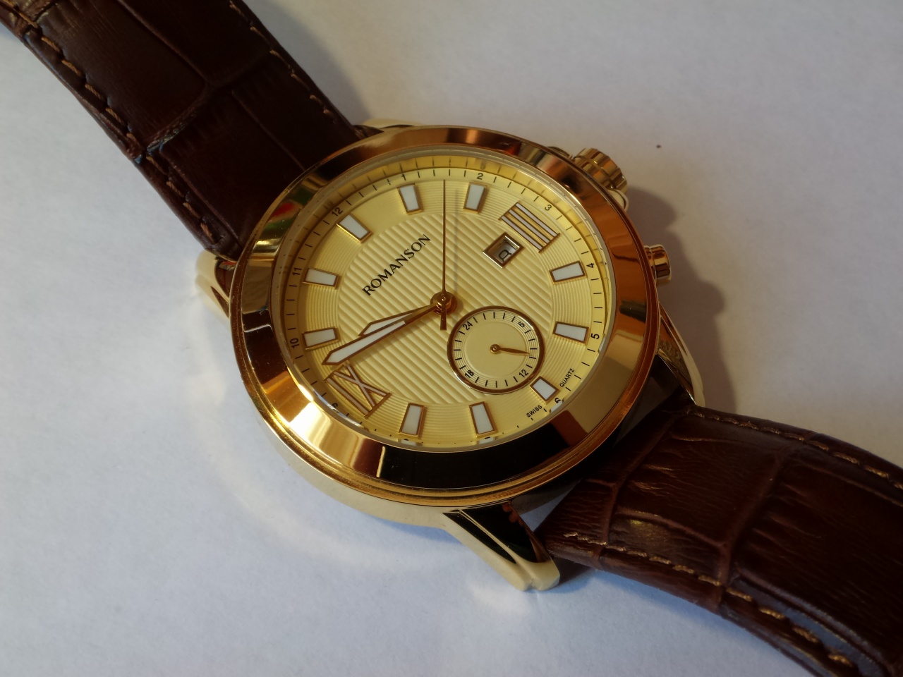 Теперь о самих часах: корпус часов изготовлен из нержавеющей стали с покрытием под золото. Механизм кварцевый. Водостойкость не высока, всего 3 атм. циферблат симпатичный , рифленый, с брутальными стрелками. Ремешок похож на кожаный с твердой поверхностью. Бакля немаленькая, с надписью Романсон. На руке сидят удобно. Часы изготовлены в Корее. Сходная форма корпуса широко эксплуатируется азиатскими производителями, поэтому уникальности не представляет.