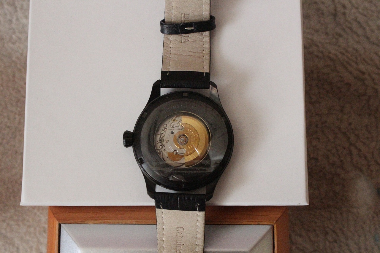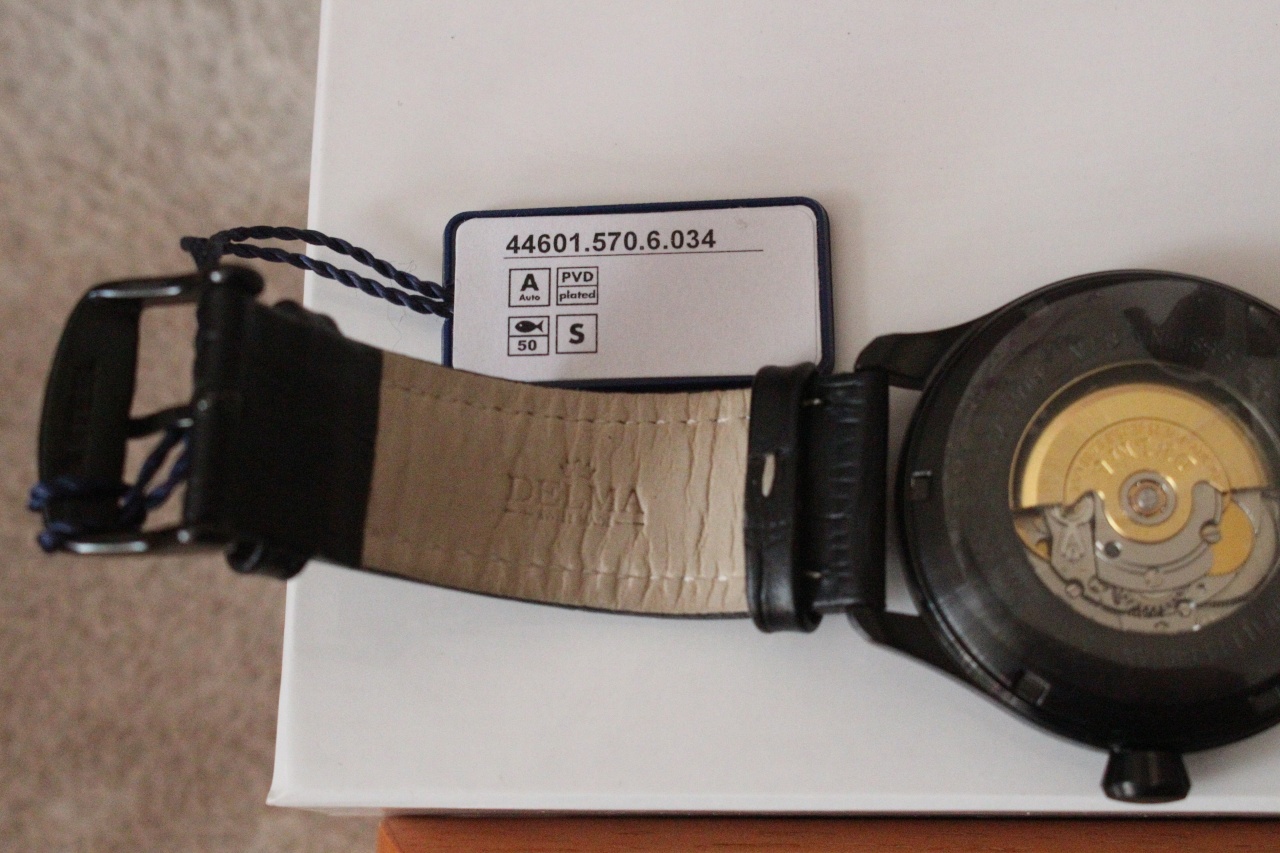 Автоматический механизм ЕТА 2824/2 (25 камней, запас хода 42 ч, частота полуколебаний баланса 28800 полуоб/час.). Автоподзавод. Центральная секундная стрелка. Окошко даты.