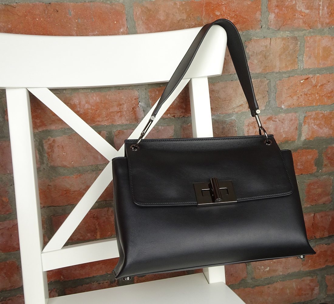 Особенность модели - сумка исполнена в стилистике "all black": черная кожа и черная глянцевая фурнитура.
