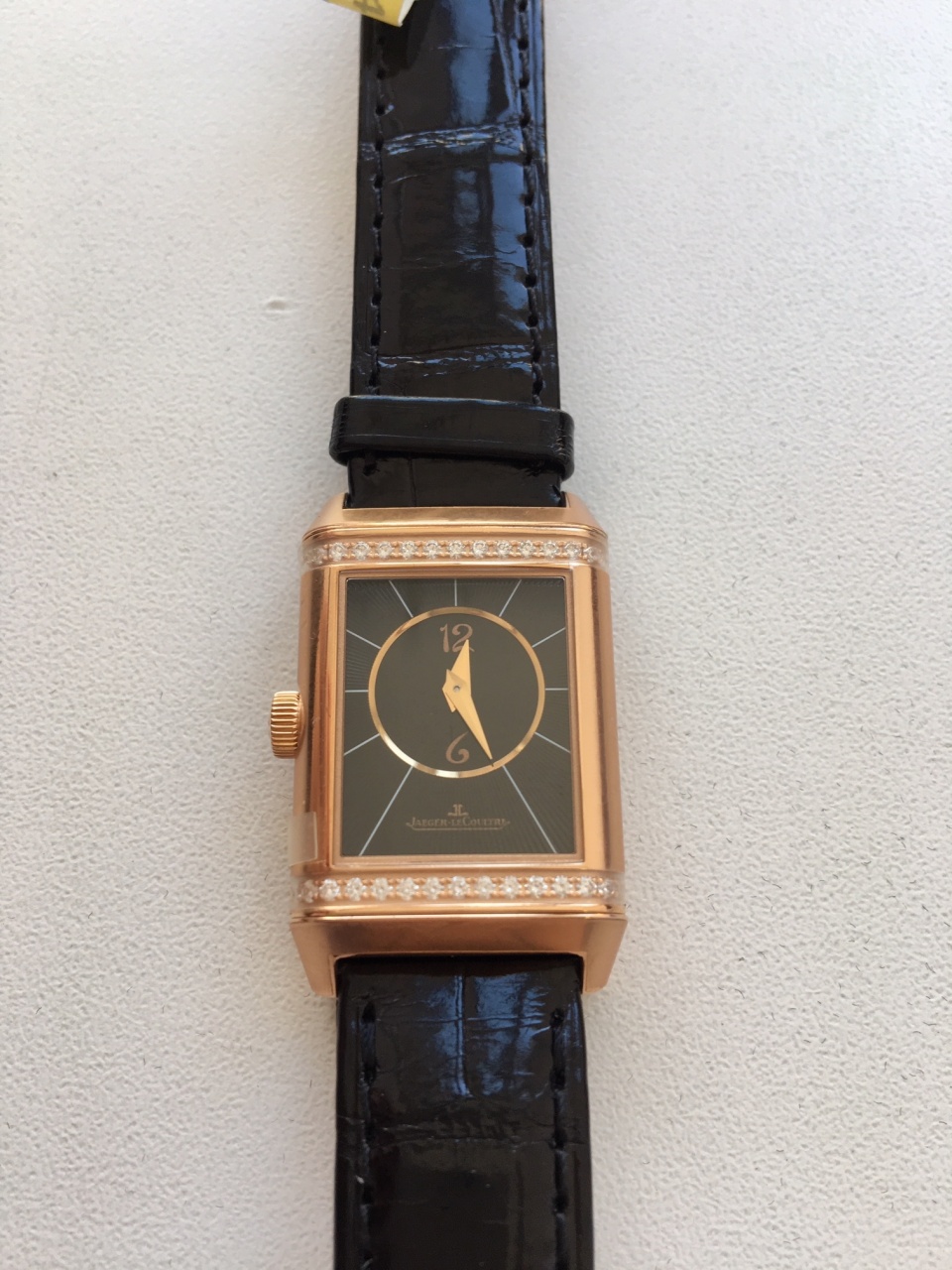 Классическая женская модель с двумя циферблатами. Серебристый циферблат с арабскими цифрами, чёрный циферблат с индексами и корпусом, украшенным 30 бриллиантами общим весом 0.28 ct.