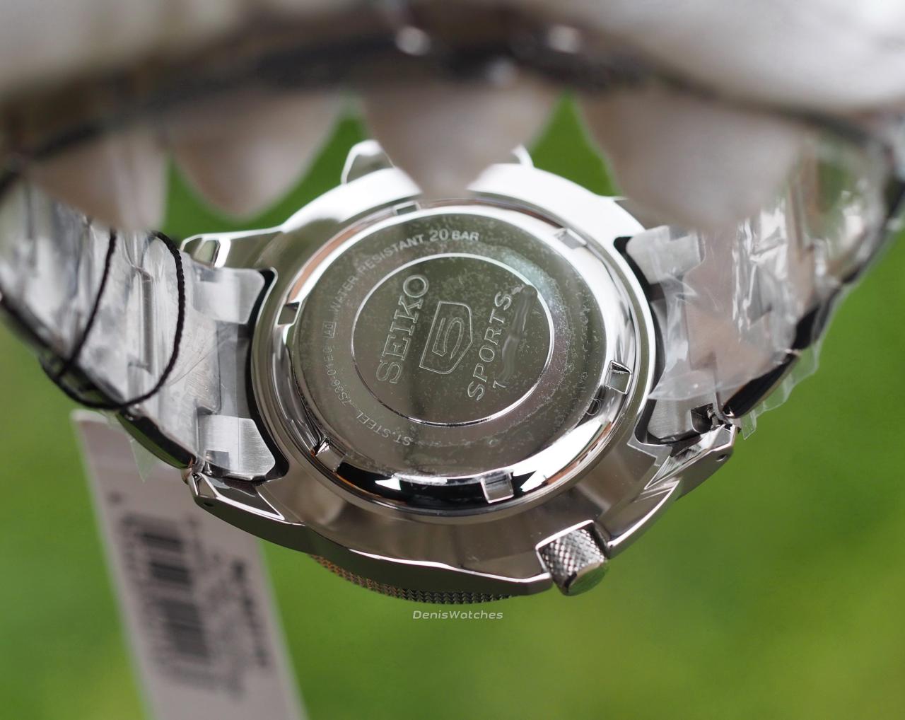 Черный глянцевый циферблат, накладные метки, окантовка даты и лого Seiko 5