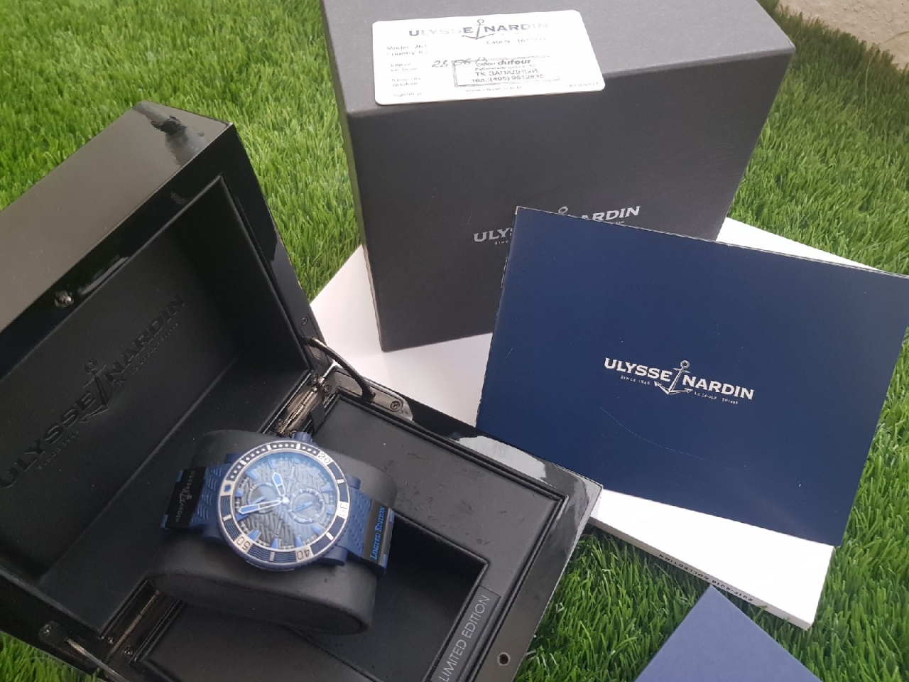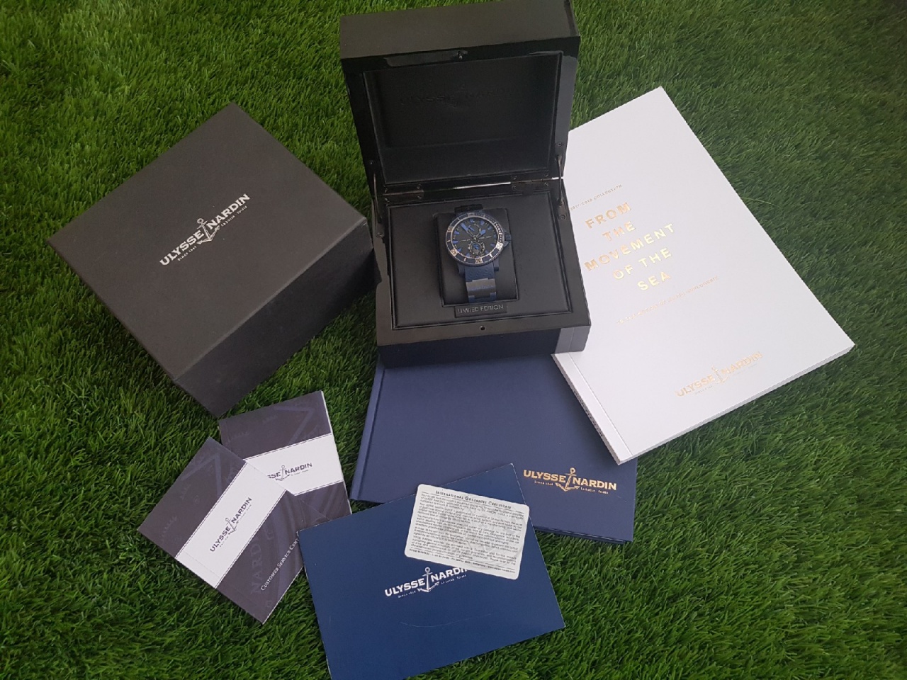 Последним пополнением дайверской коллекции Marine мануфактура из Ле Локля подтверждает свою репутацию современного инновационного часового производителя. Новые спортивные часы Blue sea станут незаменимым аксессуаром для поклонников водных видов спорта и не подведут своего владельца даже в самых экстремальных подводных условиях. Они превосходно сочетают в себе две основные функции, являясь красивым инструментом не только для отображения времени, но и для дайверского погружения. Часы Blue Sea снабжены механизмом с автоподзаводом, запасом хода 42 часа, увеличенной секундной стрелкой на дополнительном циферблате и большим окошком даты. Ulysse Nardin Blue Sea Символ решительности — эти часы демонстрируют постоянное движение компании Ulysse Nardin вперед в технологиях производства часов. Их стальной корпус диаметром 45,8 мм покрыт слоем матового синего каучука. Прозрачная задняя крышка открывает вид на механизм автоподзавода, также голубого цвета. Неподвижные металлические части покрыты слоем голубого титанового сплава (методом ионного напыления). Особую элегантность часам придает волнообразный рисунок, украшающий каучуковый ремешок и циферблат. Часовые метки, а также часовая и минутная стрелки покрыты голубым люминесцентным составом для улучшения видимости. Индикатор запаса хода расположен у 12-часовой отметки, в то время как дополнительный циферблат и окошко даты расположены на отметке «6 часов». Сапфировое стекло имеет антибликовое покрытие. Корпус часов с индивидуальным номером, вращающимся в одну сторону безелем и фиксируемой на резьбе заводной головкой, водонепроницаем до 200 м. Выпуск этих часов лимитирован 999 экземплярами, каждый корпус имеет пластину с выгравированным индивидуальным номером.