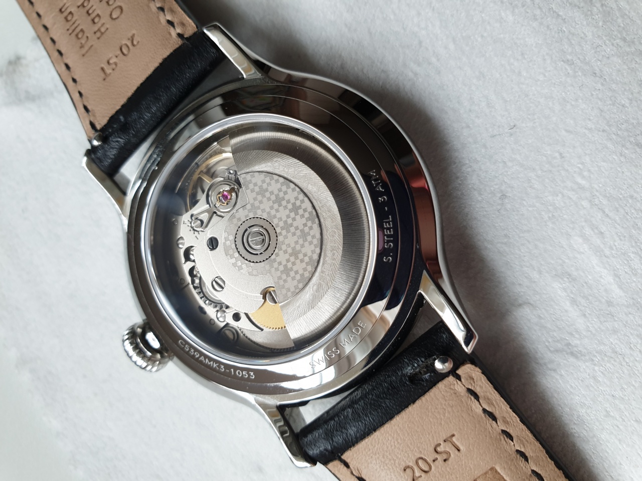 Отличные часы швейцарского производства на каждый день с красивым циферблатом, играющим на солнце, шикарными синими сатинированными стрелками, сложными по форме и прозрачной задней крышкой, через которую видно работу надёжного швейцарского механизма с фирменной гравировкой на роторе автоподзавода.
