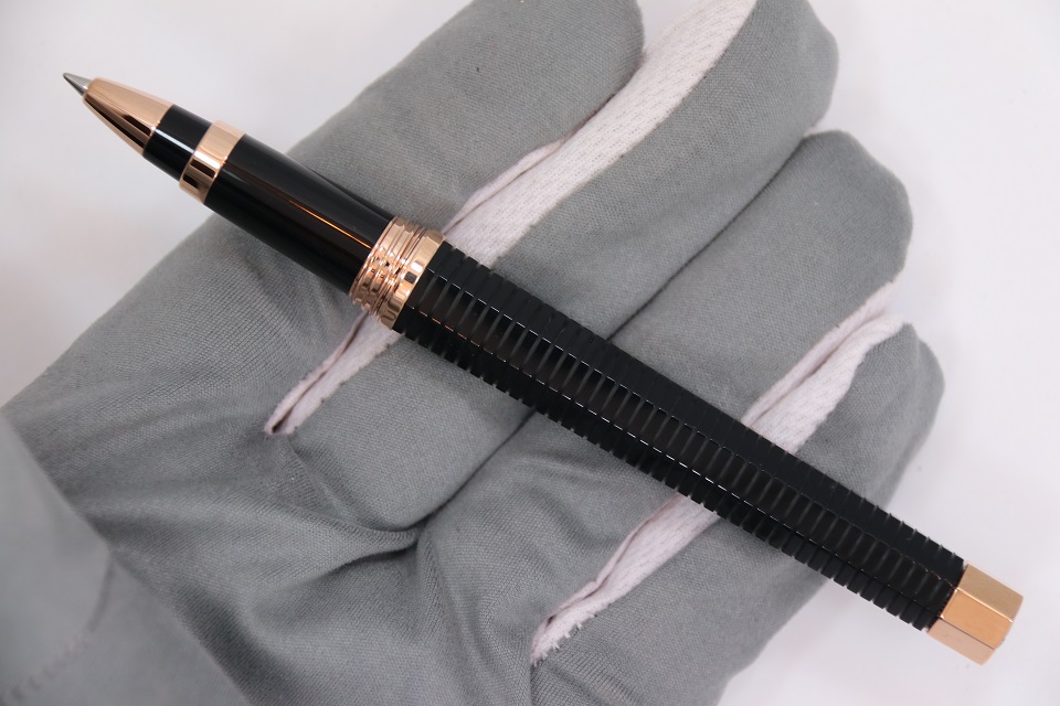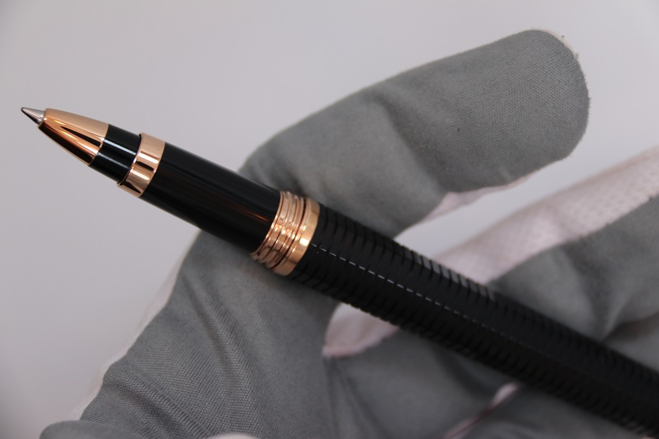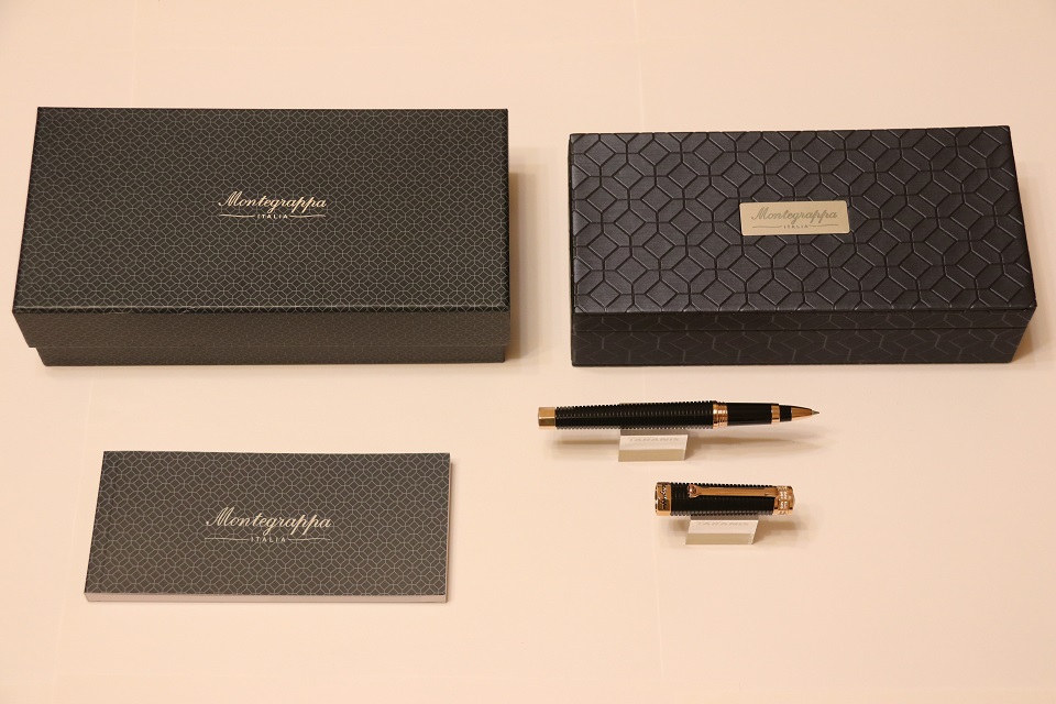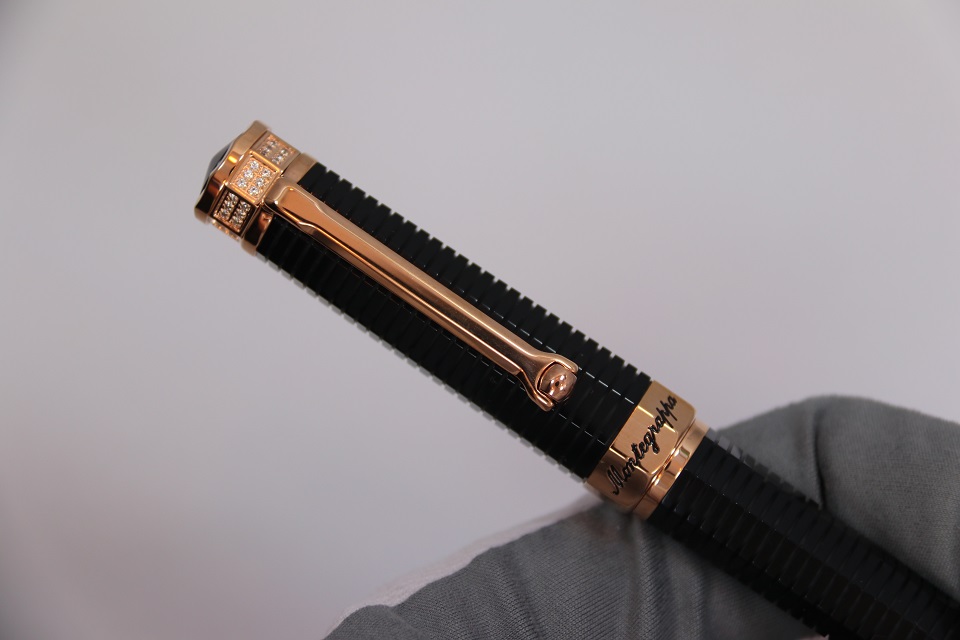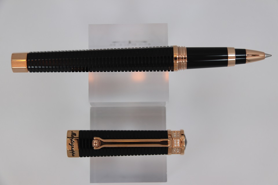 Ручка-роллер Монтеграппа NeroUno, выполненная в неповторимом восьмигранном дизайне серии Nero Uno Linea, украшенном горизонтальными кольцевыми линиями. Корпус пишущего инструмента сделан в строгом черном цвете из драгоценной смолы. Металлические делали покрыты золотом. Верхняя часть инструмента так же украшена ювелирными кристаллами Сваровски, выложенными по всей окружности колпачка. На ободе в нижней части колпачка выгравирован логотип компании Монтеграппа.
