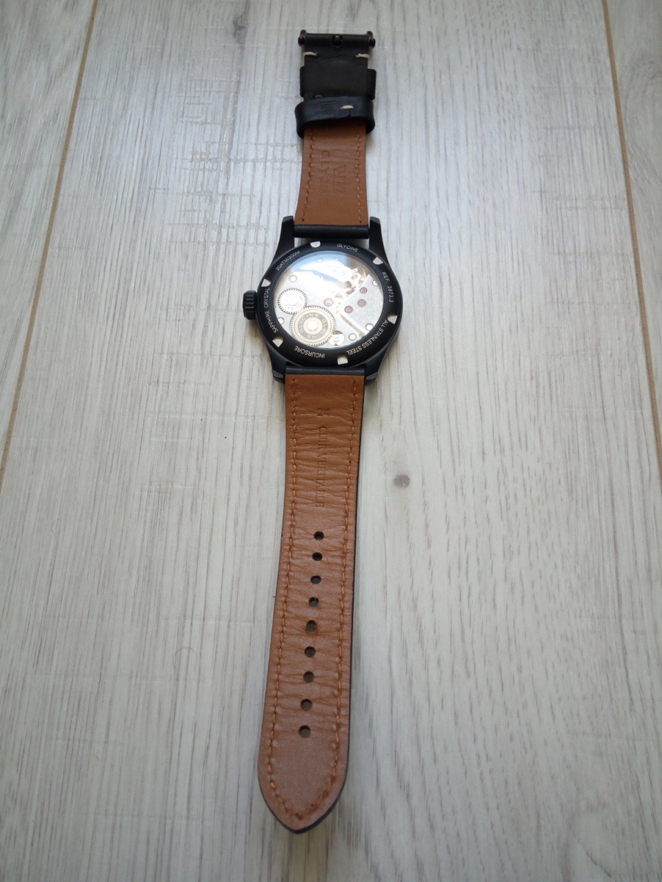 Брутальные, харизматичные часы в черном цвете на ручном, отлично декорированном калибре.