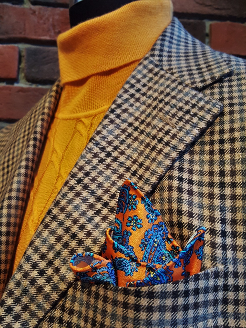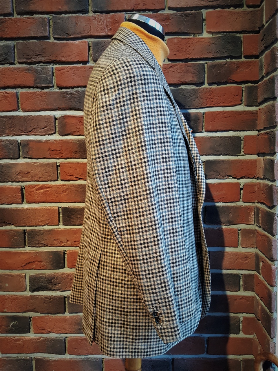 На рукавах пиджак имеет четыре пуговицы коричневого цвета из короццо, с полностью "рабочими" (растёгивающимися) петлями.