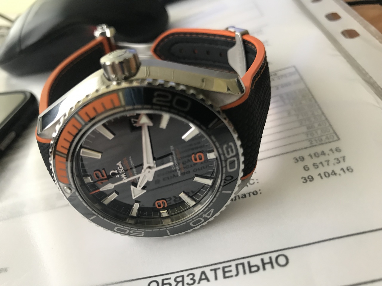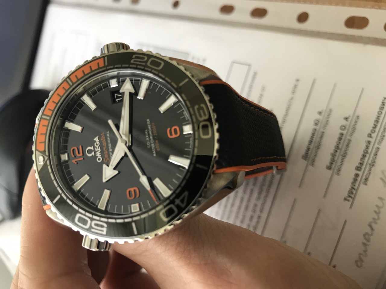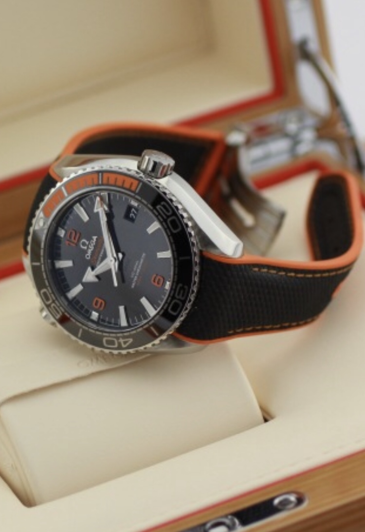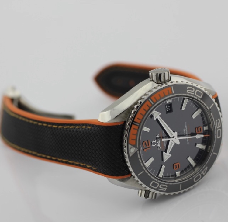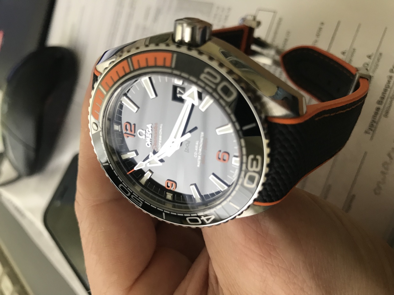 Часы оригинальные Seamaster Planet Ocean 600 m Omega Co-Axial Master Chronometer 43,5 mm 215.32.44.21.01.001 из нержавеющей стали, на каучуковом черном ремешке, с черным циферблатом и вращающимся в одном направлении безелем,2016 года выпуска. Матовый корпус из нержавеющей стали с полированными скошенными углами, диаметром 43,5 мм и высотой 16,04 мм. Вращающийся в одном направлении безель изготовлен из нитрид-кремниевой керамики серого цвета на поверхности которого выполнена дайверская шкала из Liquidmetal®. Промежуток в 15 минут из оранжевого оцинкованного каучука, точка на 12 часах заполнена люминесцентным составом. Черный циферблат украшен минутной разметкой, с продолговатыми часовыми индексами, которые покрыты люминесцентным составом. Три стрелки в центре, указывают часы, минуты и секунды, с родиевым покрытием, внутренняя часть заполнена люминесцентным составом. Красиво смотрятся арабские титановые цифры с оранжевым покрытием. Окошко даты находится в положении 3 часа.