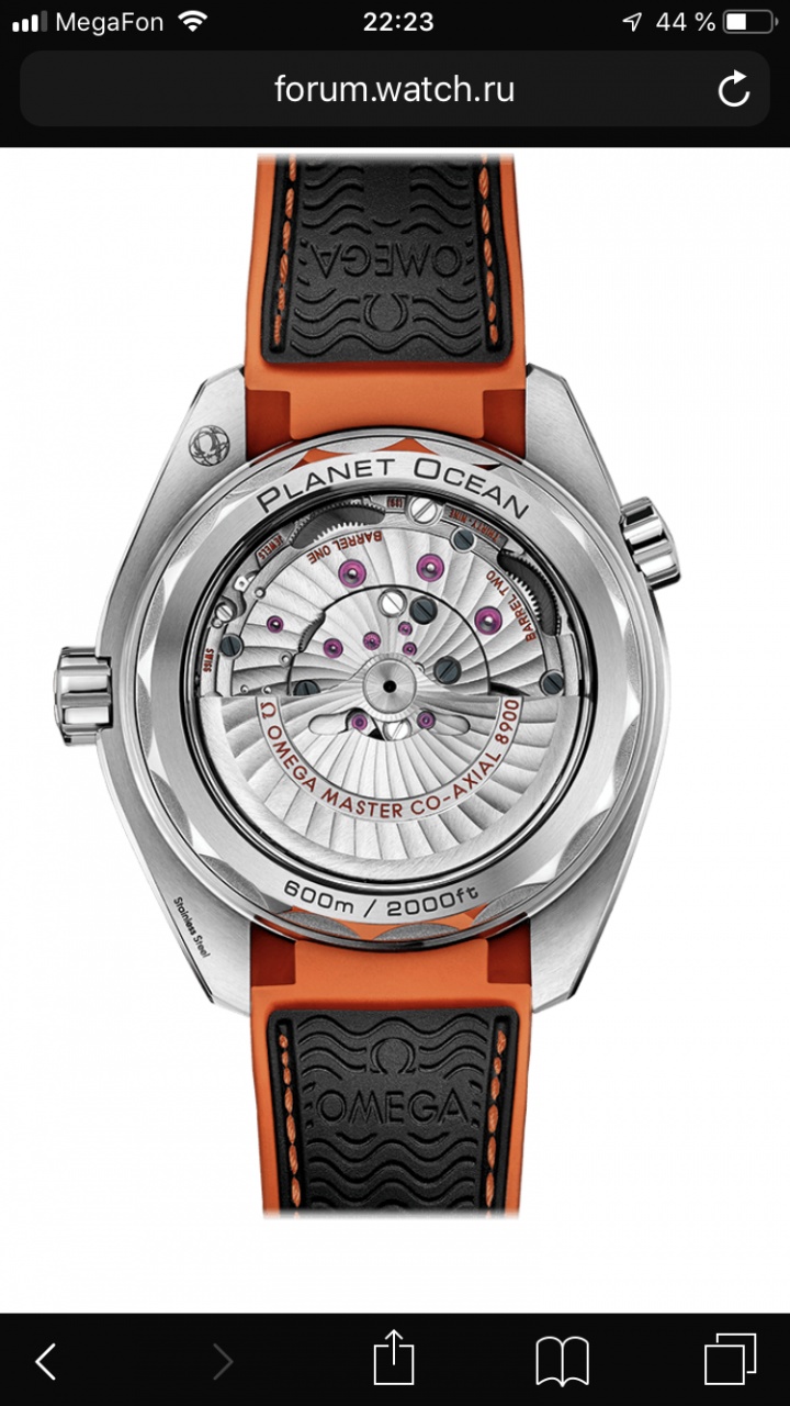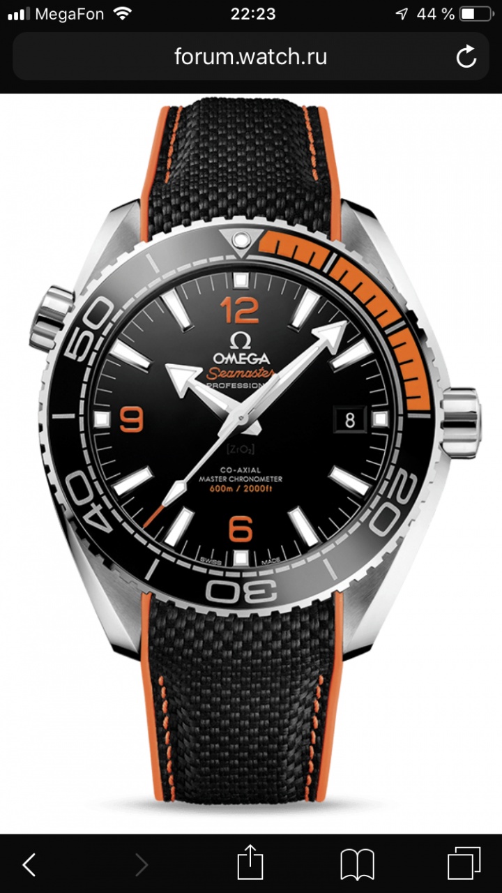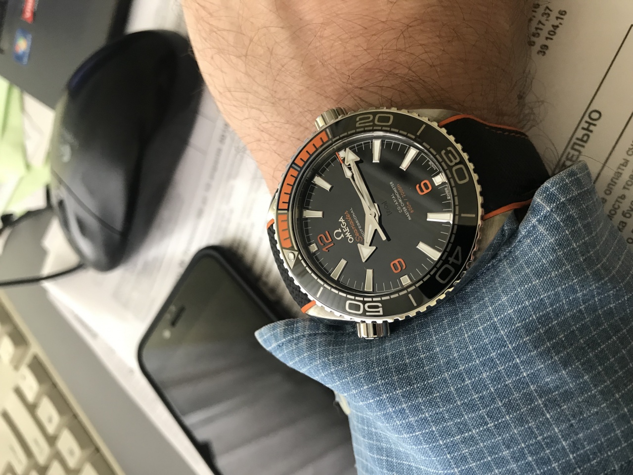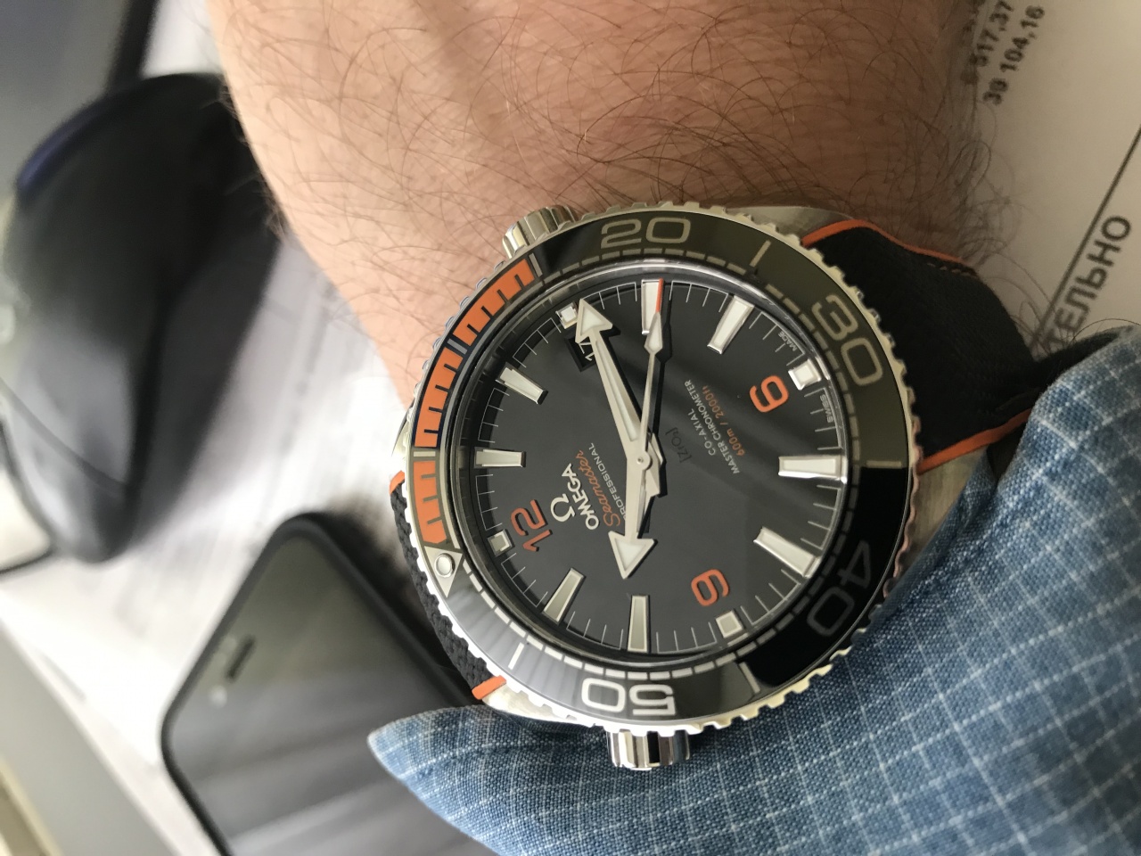 Часы оригинальные Seamaster Planet Ocean 600 m Omega Co-Axial Master Chronometer 43,5 mm 215.32.44.21.01.001 из нержавеющей стали, на каучуковом черном ремешке, с черным циферблатом и вращающимся в одном направлении безелем,2016 года выпуска. Матовый корпус из нержавеющей стали с полированными скошенными углами, диаметром 43,5 мм и высотой 16,04 мм. Вращающийся в одном направлении безель изготовлен из нитрид-кремниевой керамики серого цвета на поверхности которого выполнена дайверская шкала из Liquidmetal®. Промежуток в 15 минут из оранжевого оцинкованного каучука, точка на 12 часах заполнена люминесцентным составом. Черный циферблат украшен минутной разметкой, с продолговатыми часовыми индексами, которые покрыты люминесцентным составом. Три стрелки в центре, указывают часы, минуты и секунды, с родиевым покрытием, внутренняя часть заполнена люминесцентным составом. Красиво смотрятся арабские титановые цифры с оранжевым покрытием. Окошко даты находится в положении 3 часа.