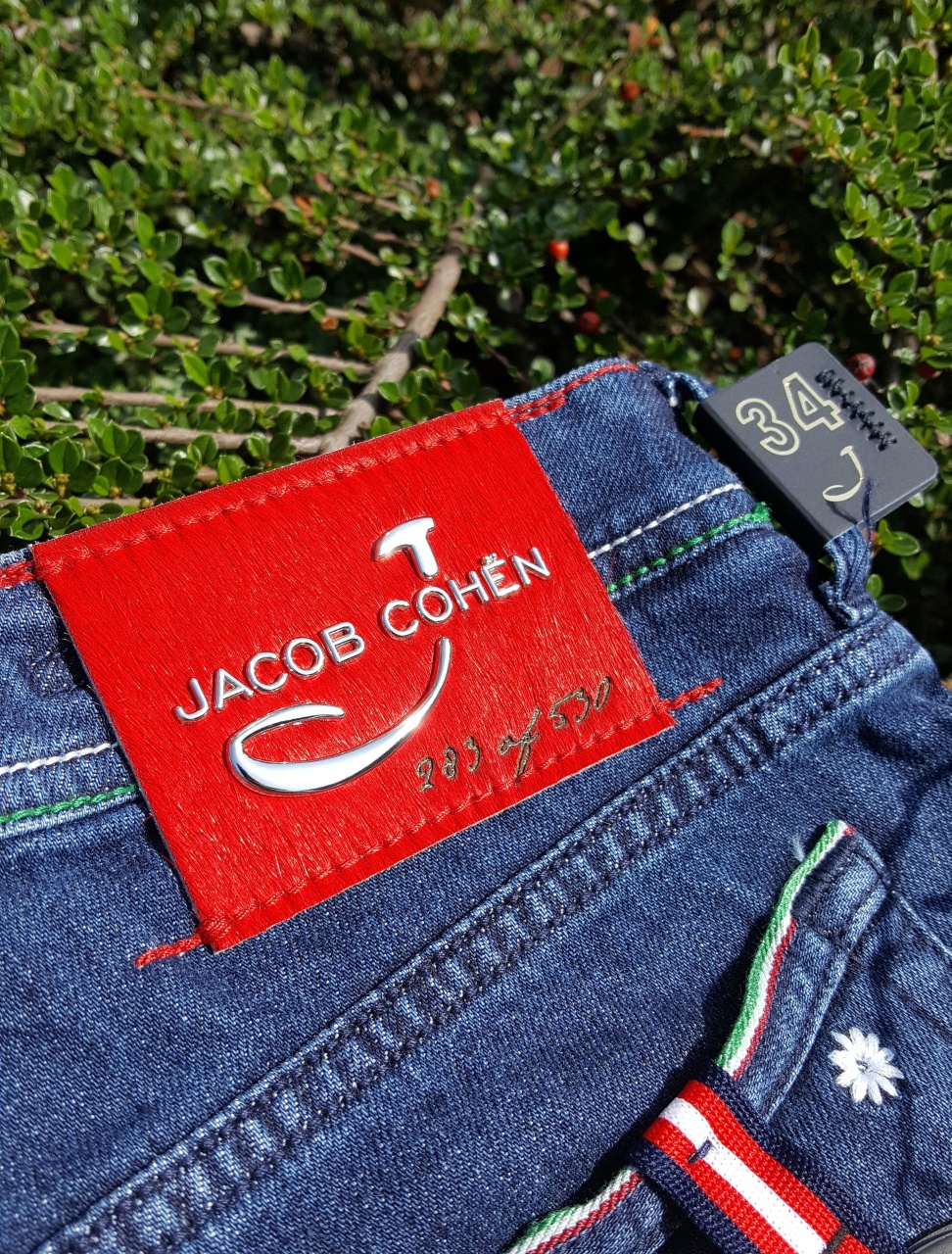 Сзади на правом бедре джинсы имеют фирменный ярлык из кожи пони красного цвета с логотипом марки Jасоb Соhеn, выполненный из металла, что указывает на принадлежность к "лимитированной" линейке марки и порядковый номер - 283