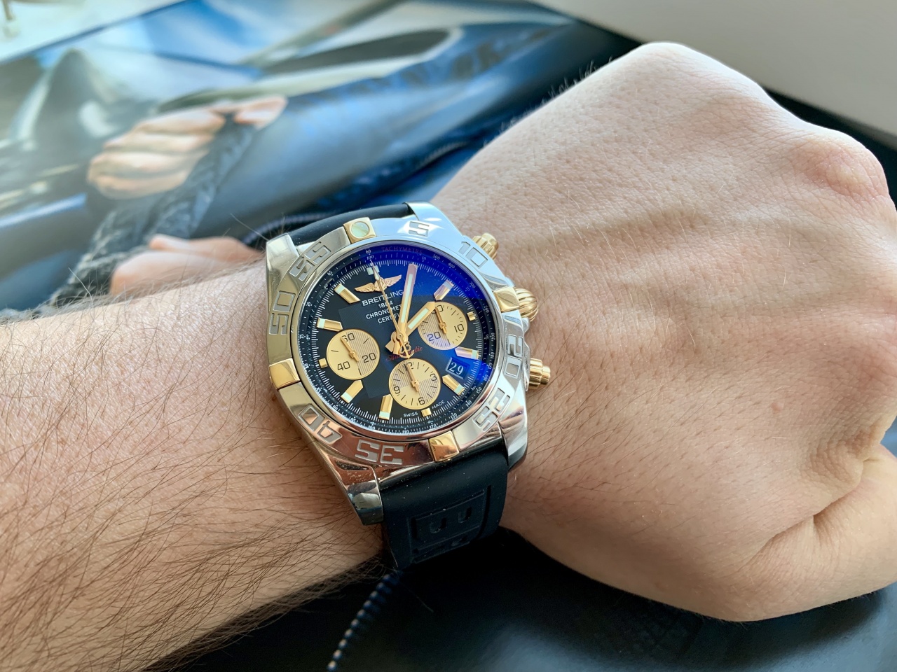 В продаже роскошный хронограф из флагманской линейки Брайтлинг. Часы в представлении не нуждаются. Топовая модель с мануфактурным механизмом и запасом хода 70 часов. Мировой ритейл без малого 10 000$. Корпус сталь с золотом. Каучуковый ремешок с фирменной клипсой, имеющую функцию быстрой корректировки ширины с помощью пушера.