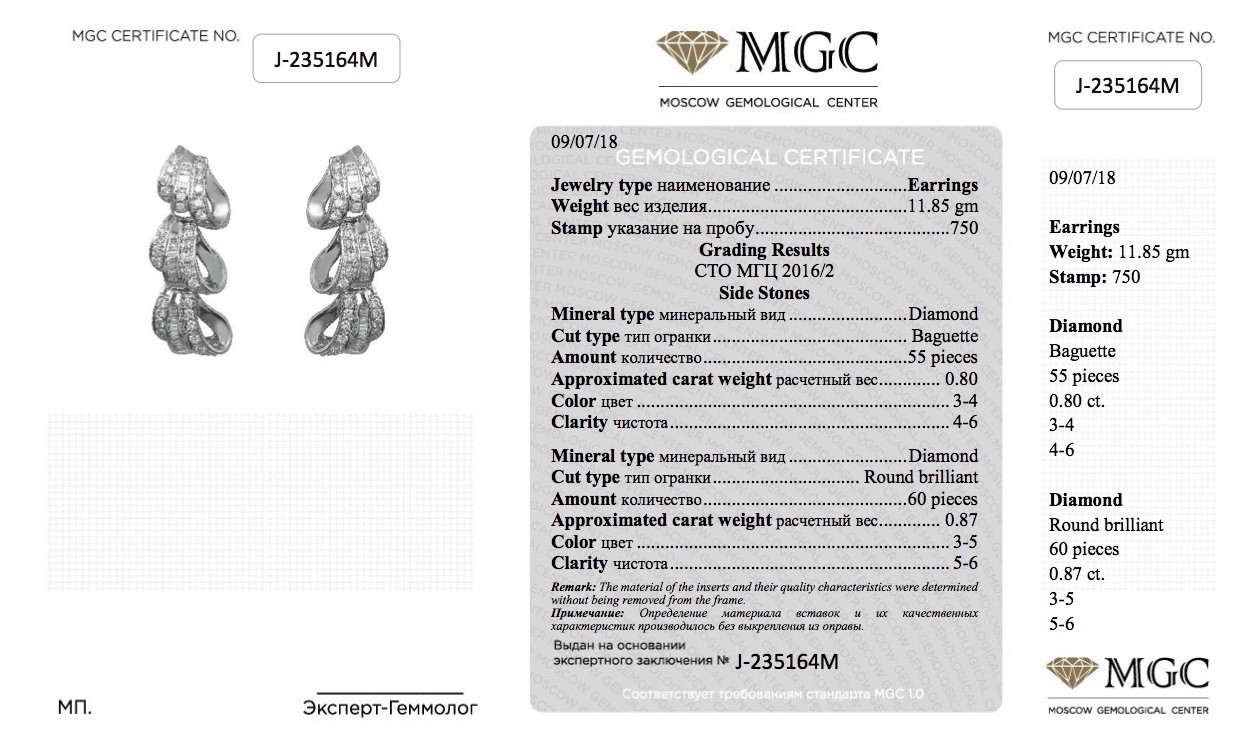 Серьги из белого золота с бриллиантами 1,67 карат (сертификат МГЦ)