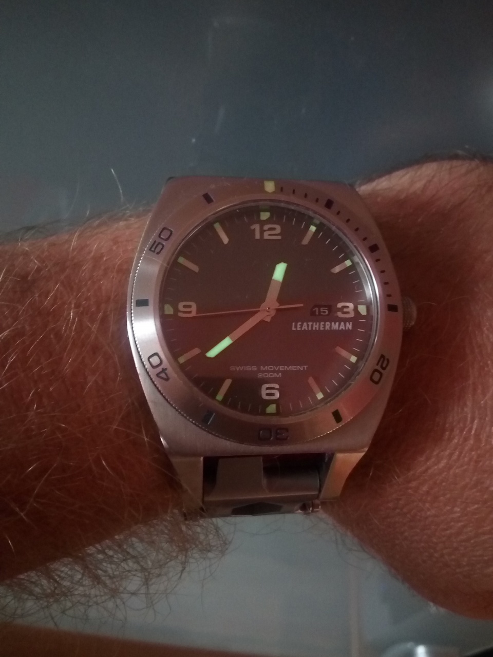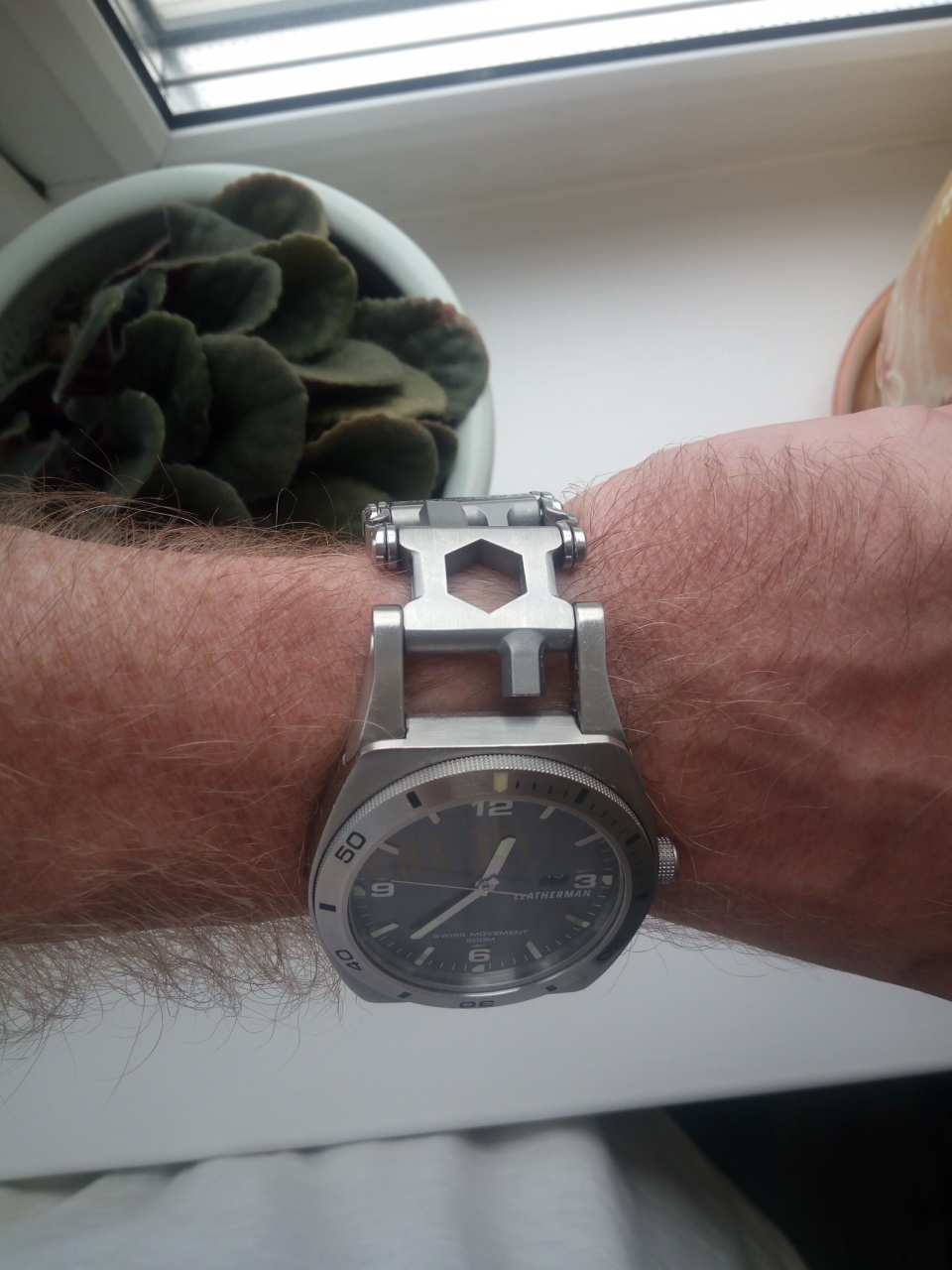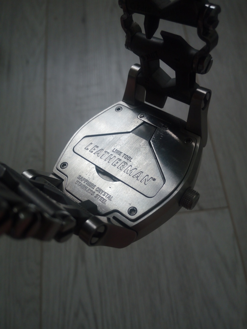 Часы на щвейцарском кварце с многофункциональным инструментом Leatherman на браслете, с сапфировым стеклом (без царапин), корпус 46 мм нержавеющая сталь с подвижными ушками для удобства посадки на руке, водозащищенные 200м, с люминесцентным покрытием стрелок.