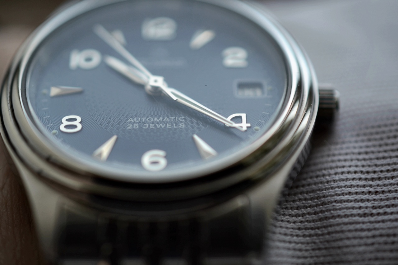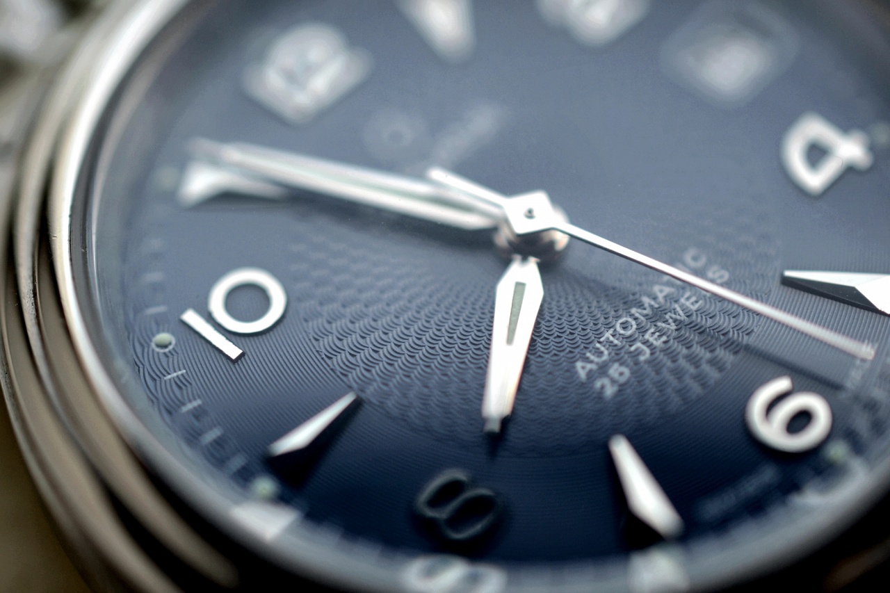 Циферблат серо-синего цвета, темного и светлого тонов, гильошированный. Метки и цифры накладные, с родиевым покрытием, цифры арабские, серебристого цвета.