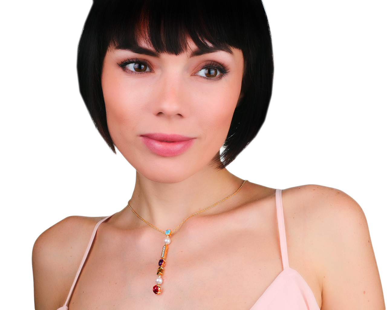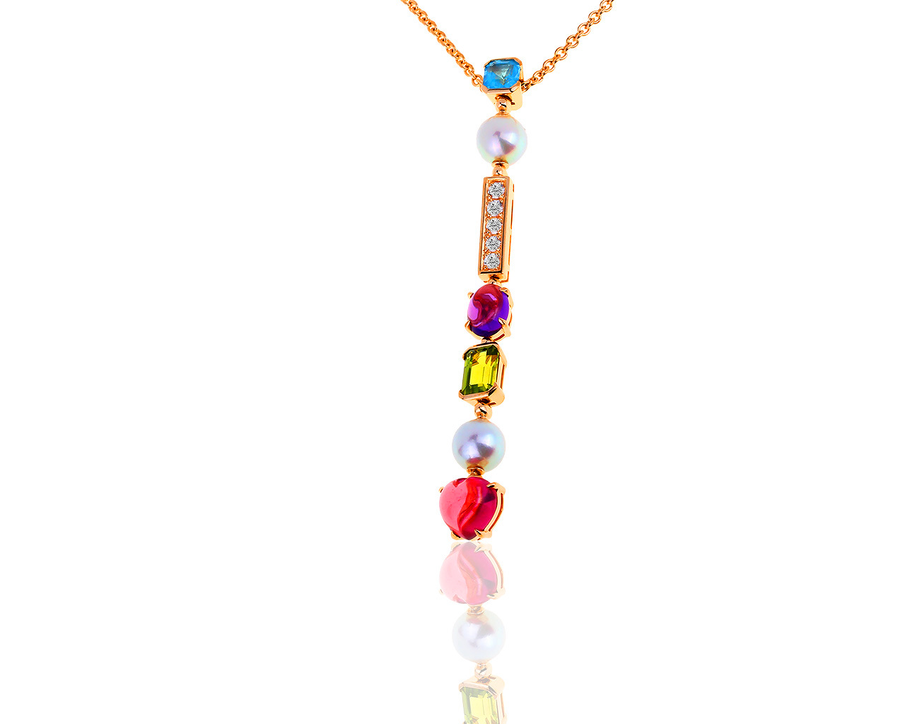 Представляем вашему вниманию яркий золотой кулон с бриллиантами 0.16ct, турмалином, аметистом, хризолитом, топазом и жемчугом Акойя от всемирно известного бренда Bvlgari из коллекции Allegra.