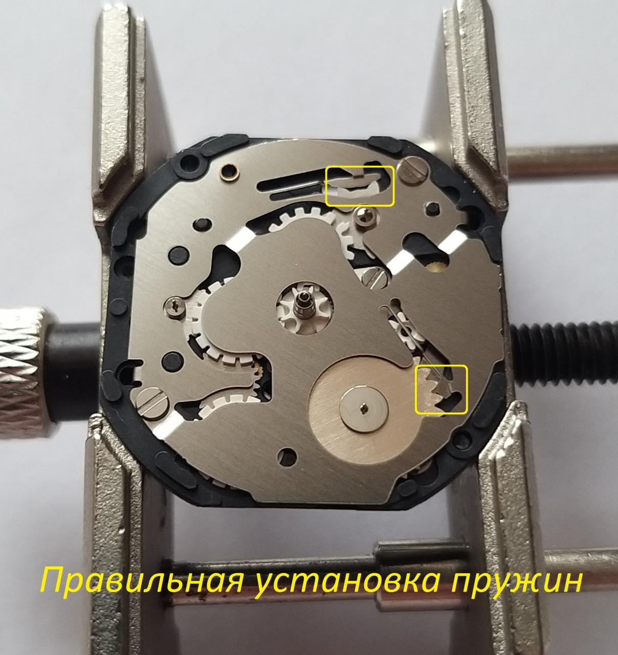 Когда собирал узел обратно, не обратил внимание что на стальной пластине есть специальные пружинки. При сборке этими пружинами зажал колеса, и при проверке хода погнул пластмассовый язычек переводного колеса дней недели. Колесо заменил, хорошо что был такой же некомплектный механизм.