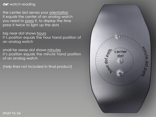 Часы, по сути, состоят из гибкого растягивающегося полимерного браслета. Механизм, расположенный в середине браслета, состоит из трех цилиндров. Первый из них постоянно выделяется на верхней поверхности браслета в виде бугорка (являющегося центральной точкой виртуального циферблата), нажатие на который приводит к появлению еще двух бугорков (точечных индикаторов часов и минут). Через пять секунд эти индикаторы исчезают.
