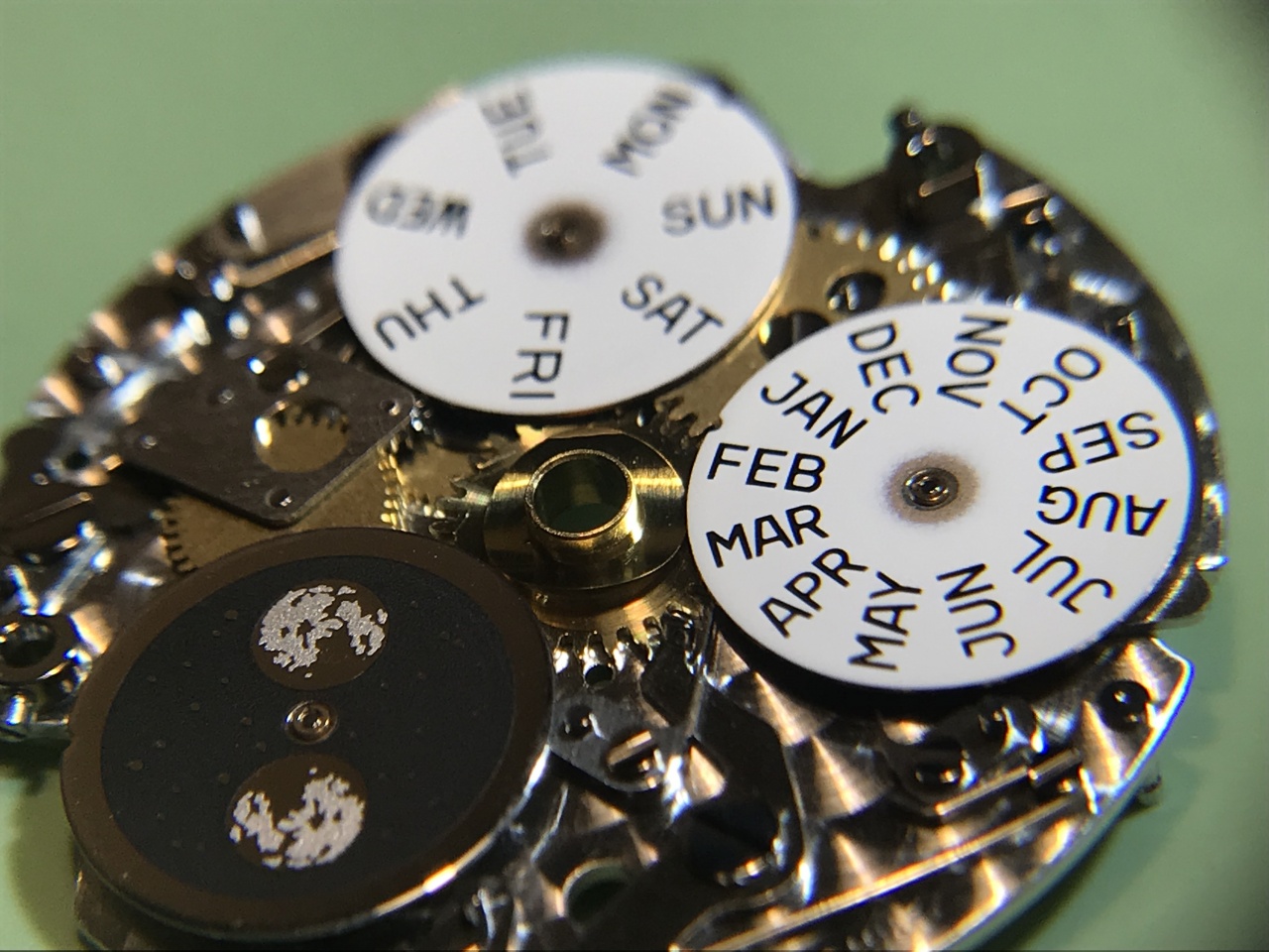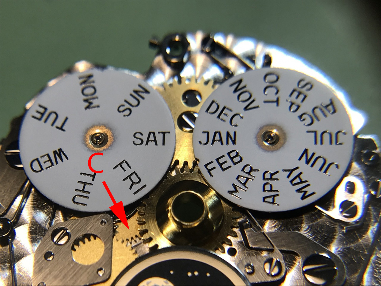 2. при разъединении механизма от модуля колесо даты А выходит из зацепления с часовым колесом и свободно удерживается только за счет дисков календарей.