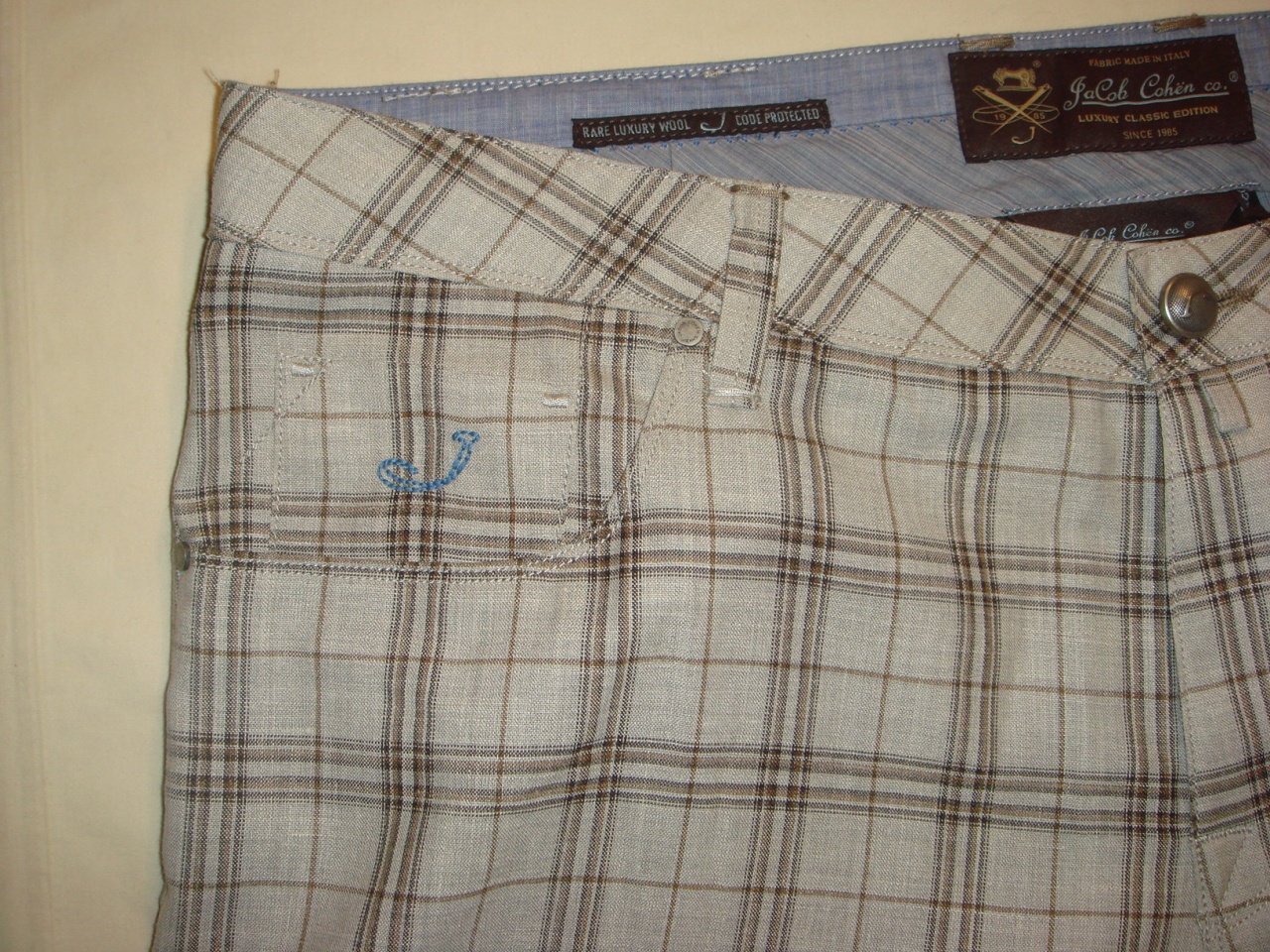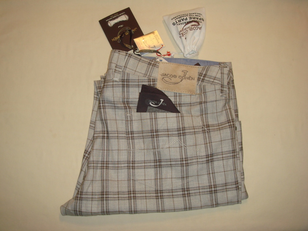 Продаются новые мужские летние шерстяные брюки джинсового кроя ручной работы итальянского бренда JACOB COHEN, превосходного исполнения, цвет светло-серый в коричневую клетку, логотип, TYPE 688 , клаcическая посадка на талии (regular fit), застёгивается на пуговицы из буйволиного рога и основную фирменную посеребренную пуговицу с логотипом бренда, фирменный ярлык из кожи пони бежевого цвета с вышитым логотипом марки Jасоb Соhёn, к брюкам прилагается платок, состав: 70% высококачественная шерсть( фабрика Loro Piana) , 15% шелк, 15 % лен, все бирки прилагаются , гарантированный 100% оригинал, размер 42 , производство Италия