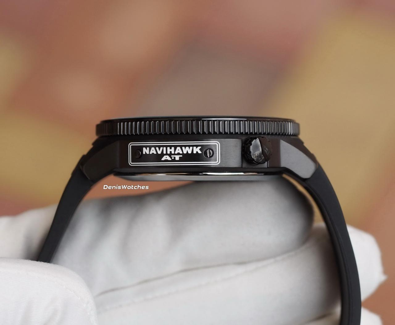 Стальной корпус, сатинированный, полностью в стойком черном ионном покрытии, на боку табличка с названием серии - Navihawk